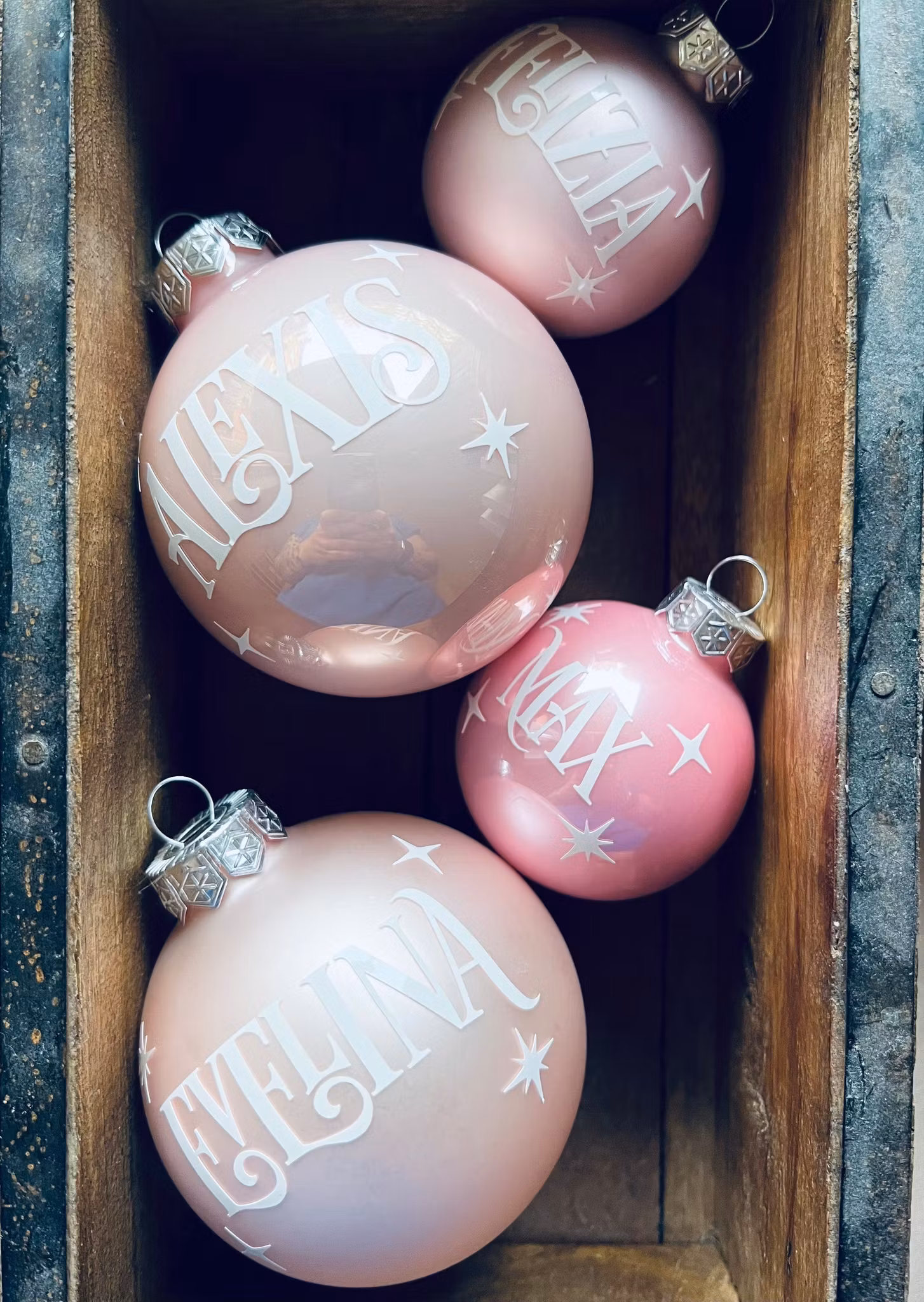 Otroligt vackra julkulor i rosa glas med personligt namn i form av vinyltryck på glaset. En fin gåva som kommer hänga i granen i många år framöver! Finns i matt eller blank, du väljer själv vilken variant och vilken storlek du vill ha. Du skriver vilket namn du vill ha på julkulan i rutan märkt "Namn".  Storleken på namnet baseras på längden på namnet, tex blir namnet Alexandra lite mindre än det kortare namnet Ida.