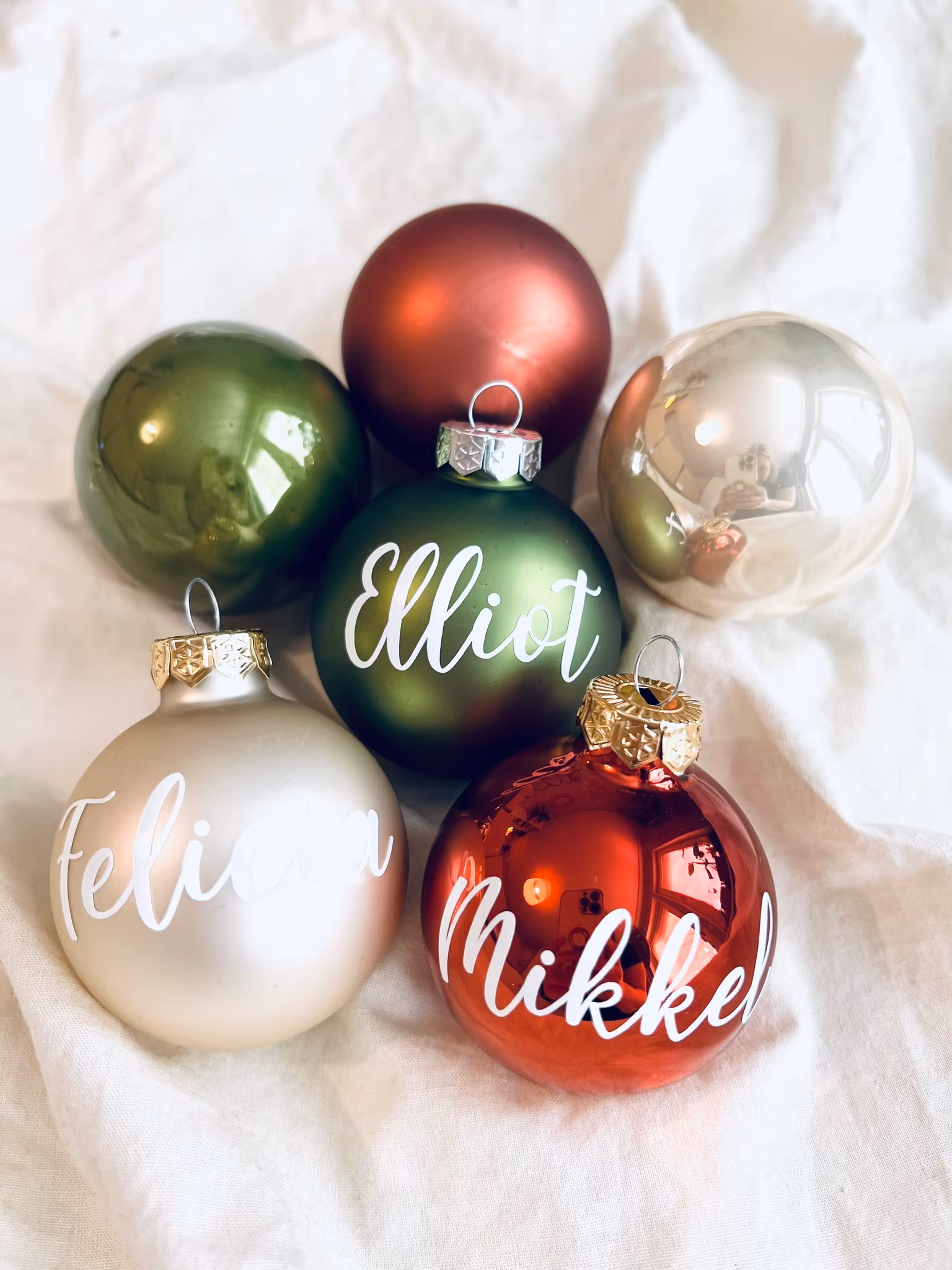 Otroligt vackra julkulor i glas i olika färger med personligt namn i form av vinyltryck på glaset. En fin gåva som kommer hänga i granen i många år framöver!