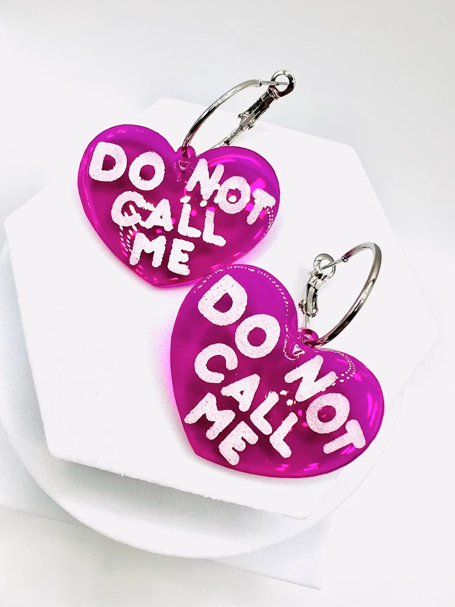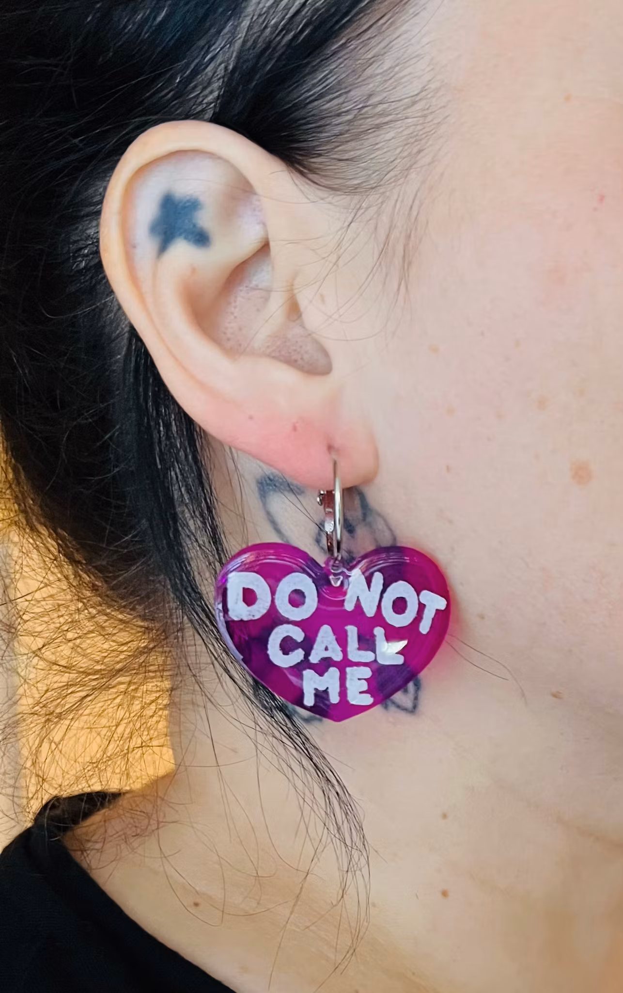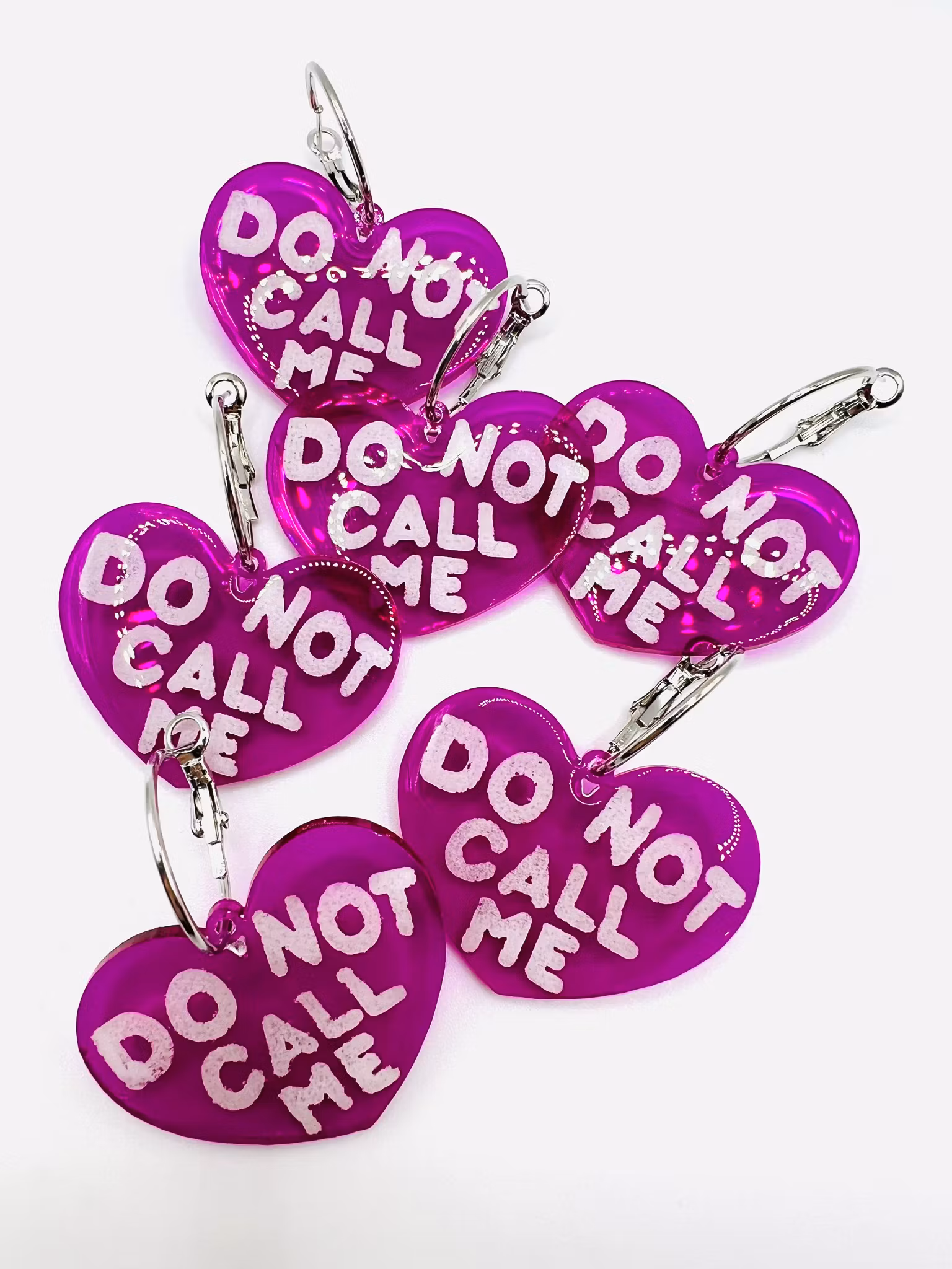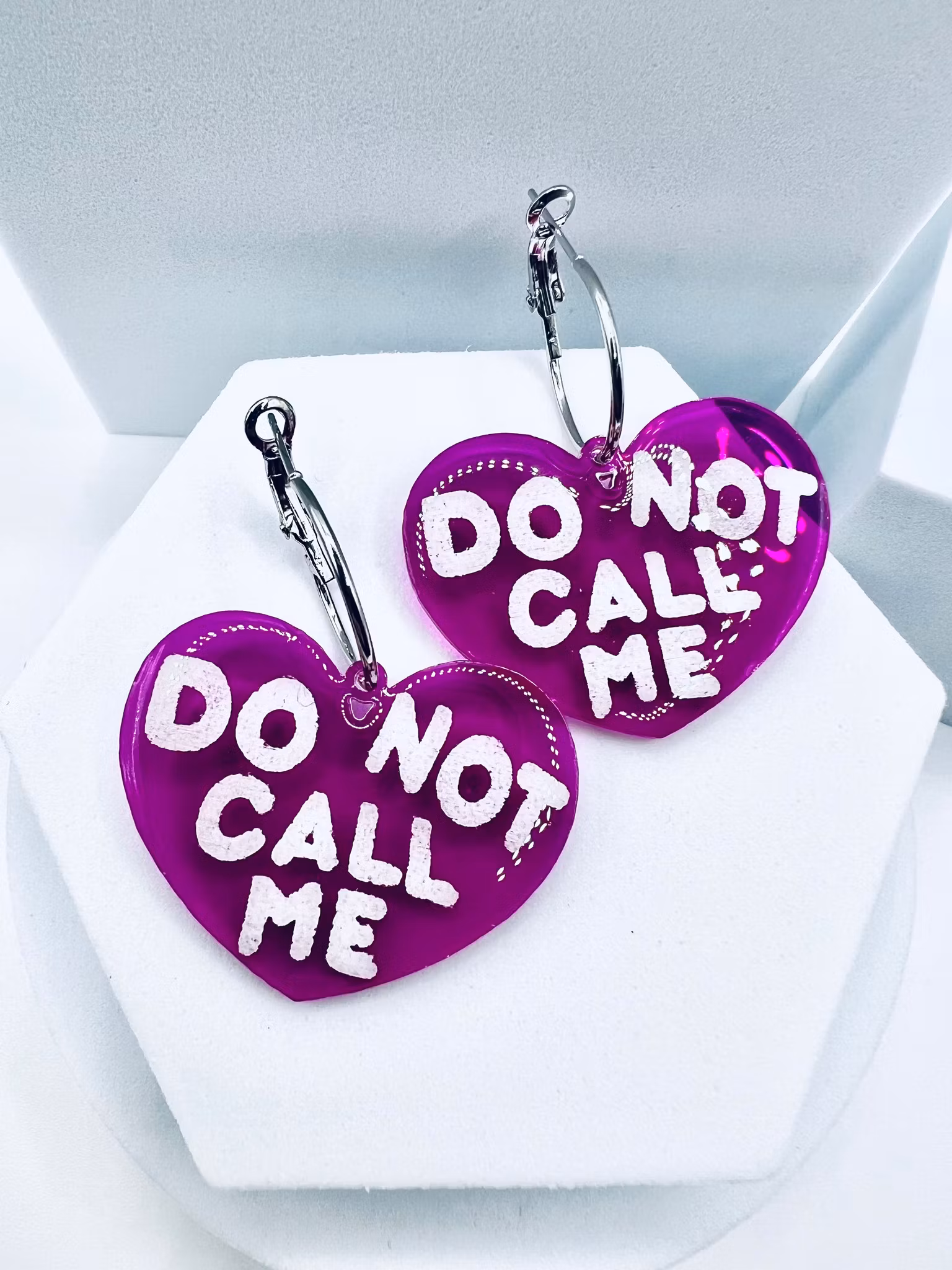 Unika och handgjorda örhängen i lila akryl som graverats och sedan handmålats och slutligen täckts med ett skyddande lager klar resin och härdats. Själva hjärtana mäter 4x3 cm stora och ringarna 2 cm. Dessa är limiterad upplaga och när de är slut är de slut.