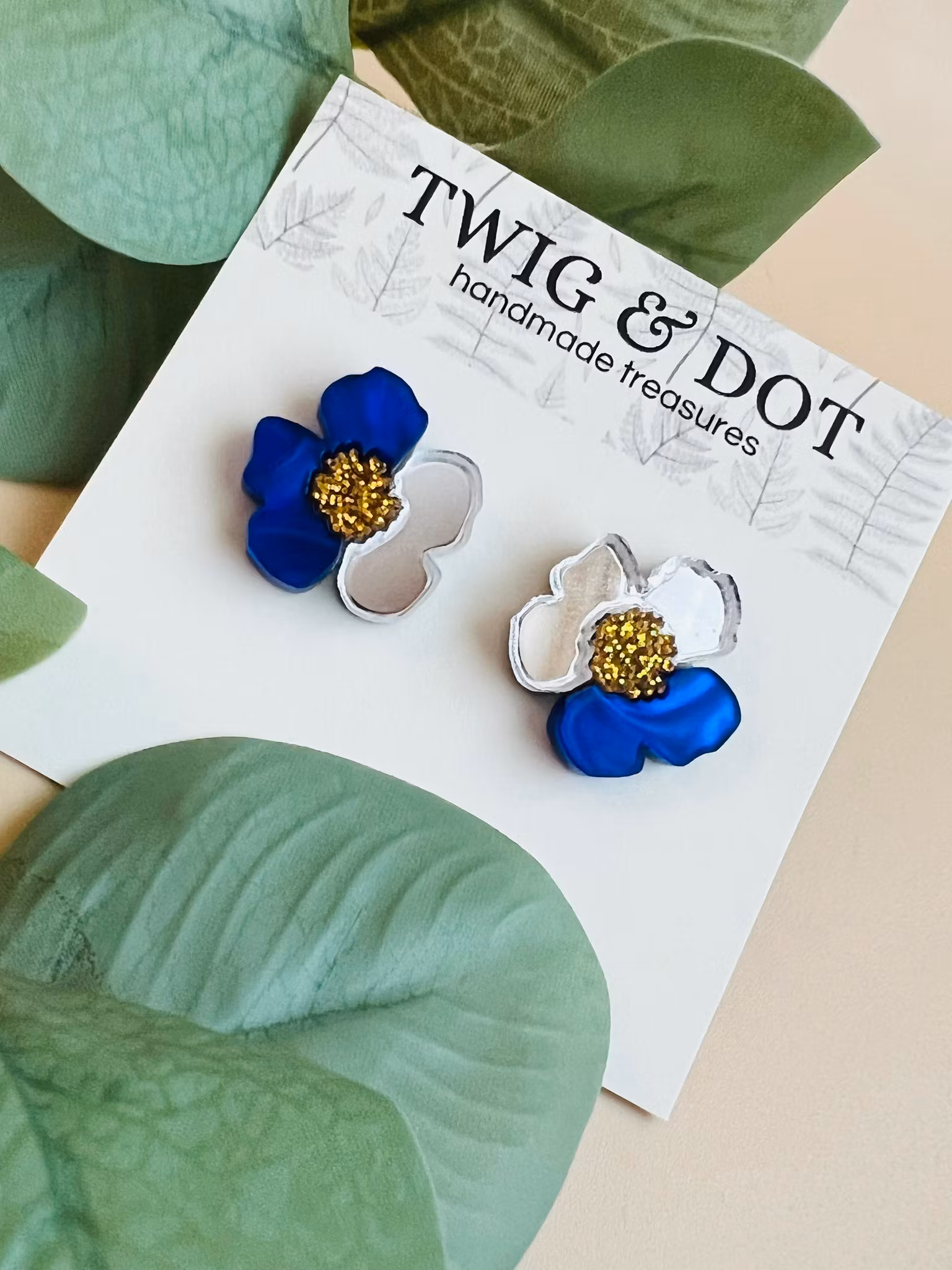 Unika och handgjorda örhängen i akryl och spegelakryl, förstärkta på baksidan med resinfinish. Dessa örhängen är lättviktiga och otroligt vackra men svårfotade då det är just spegelakryl - de är ännu vackrare i verkligheten! De monteras för hand av olika laserskurna delar för att bilda en helhet. Ett smycke för den som söker något speciellt och småskaligt! De mäter 1,9 cm.