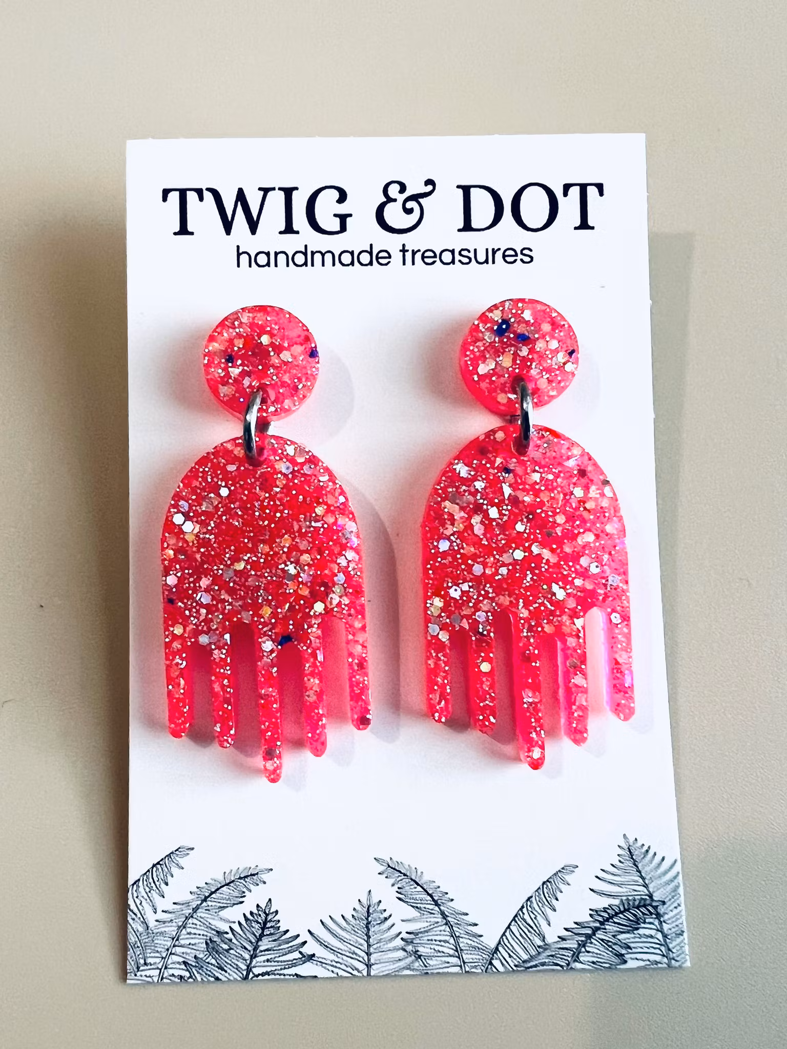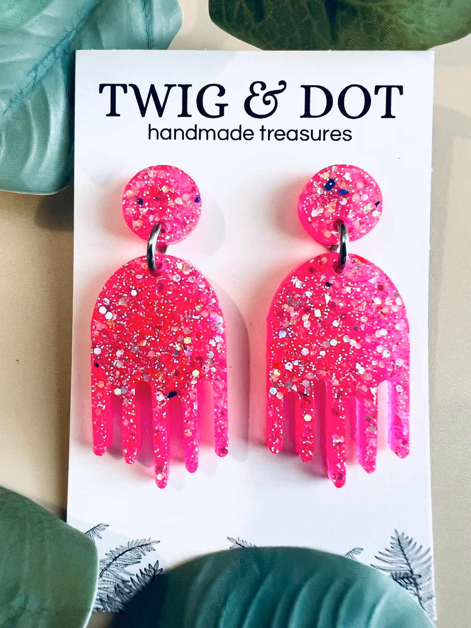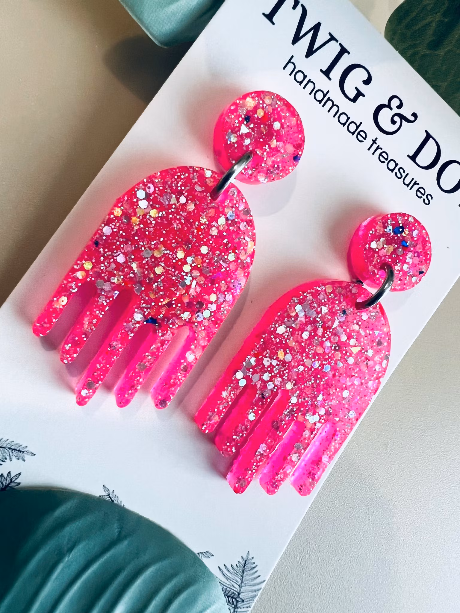 Vackra örhängen gjutet i hårt resin med glitter! Allt är handgjort och unikt, smycket är gjutet för hand. Mäter 4,7 cm stora.