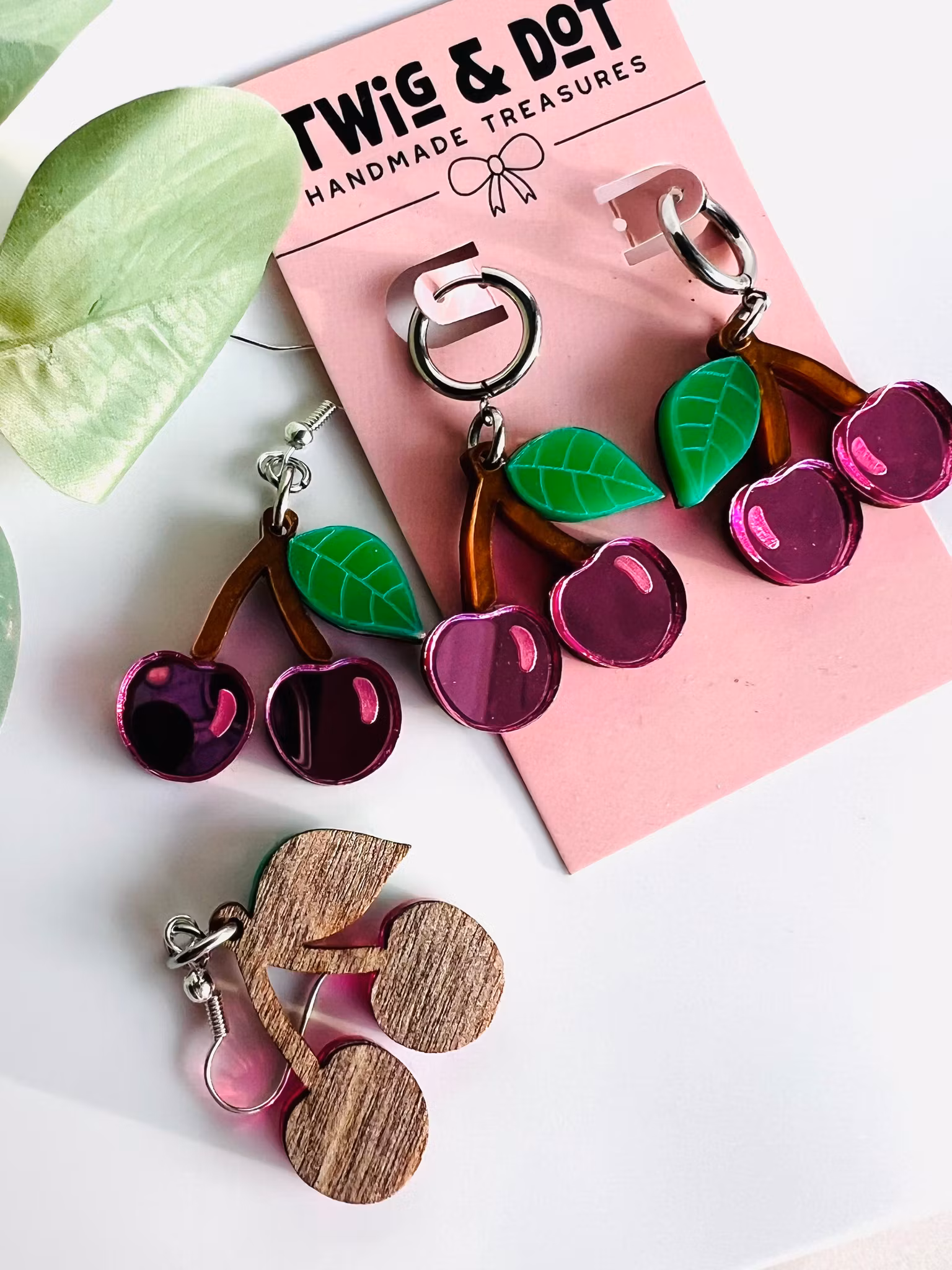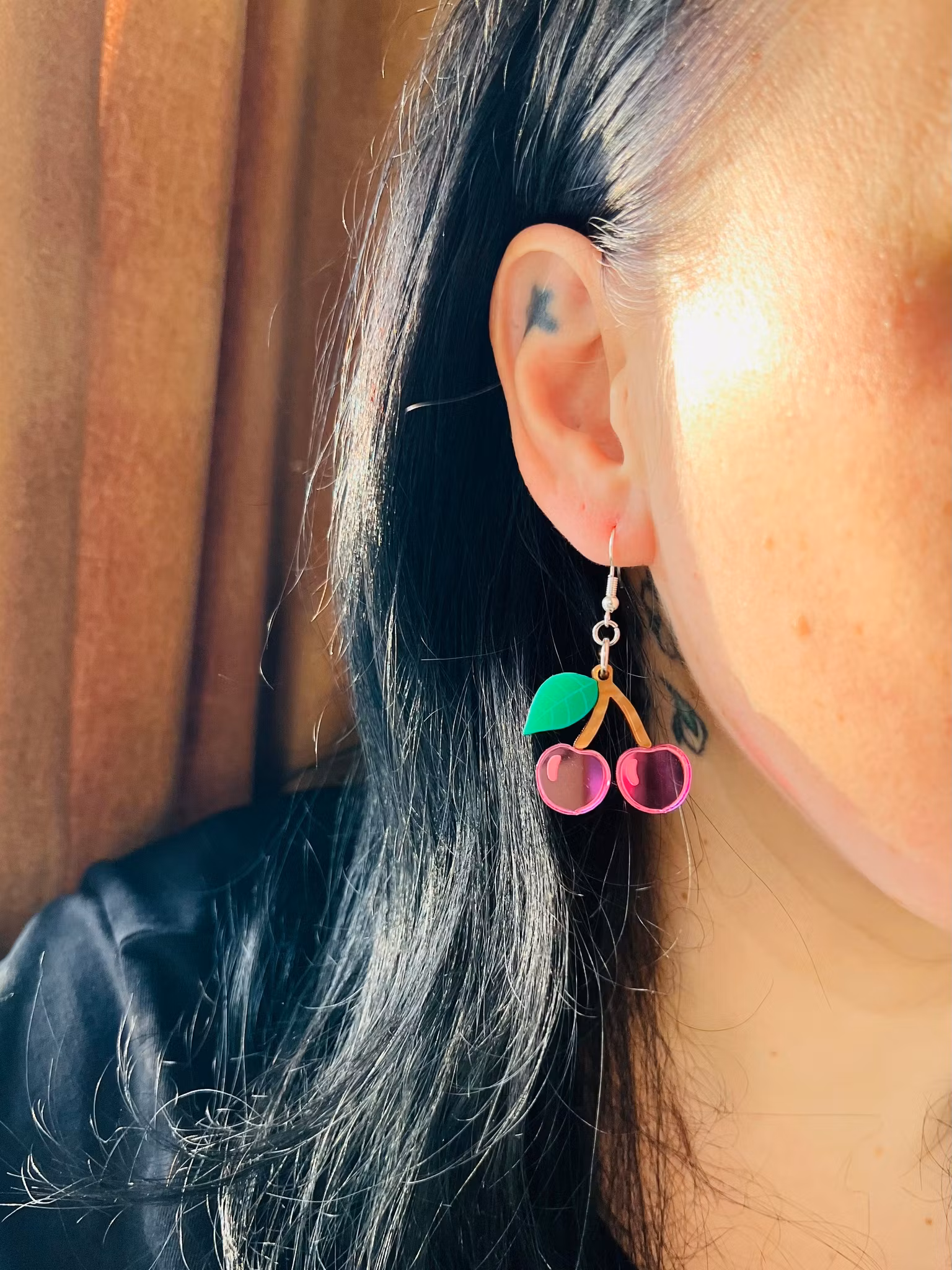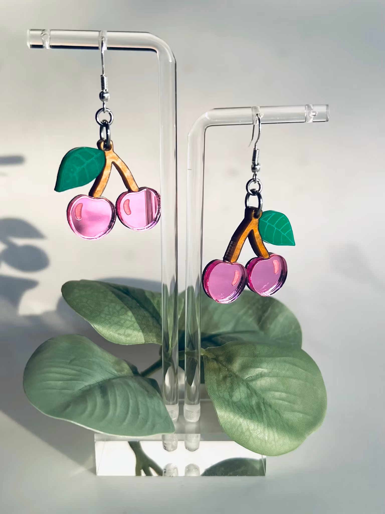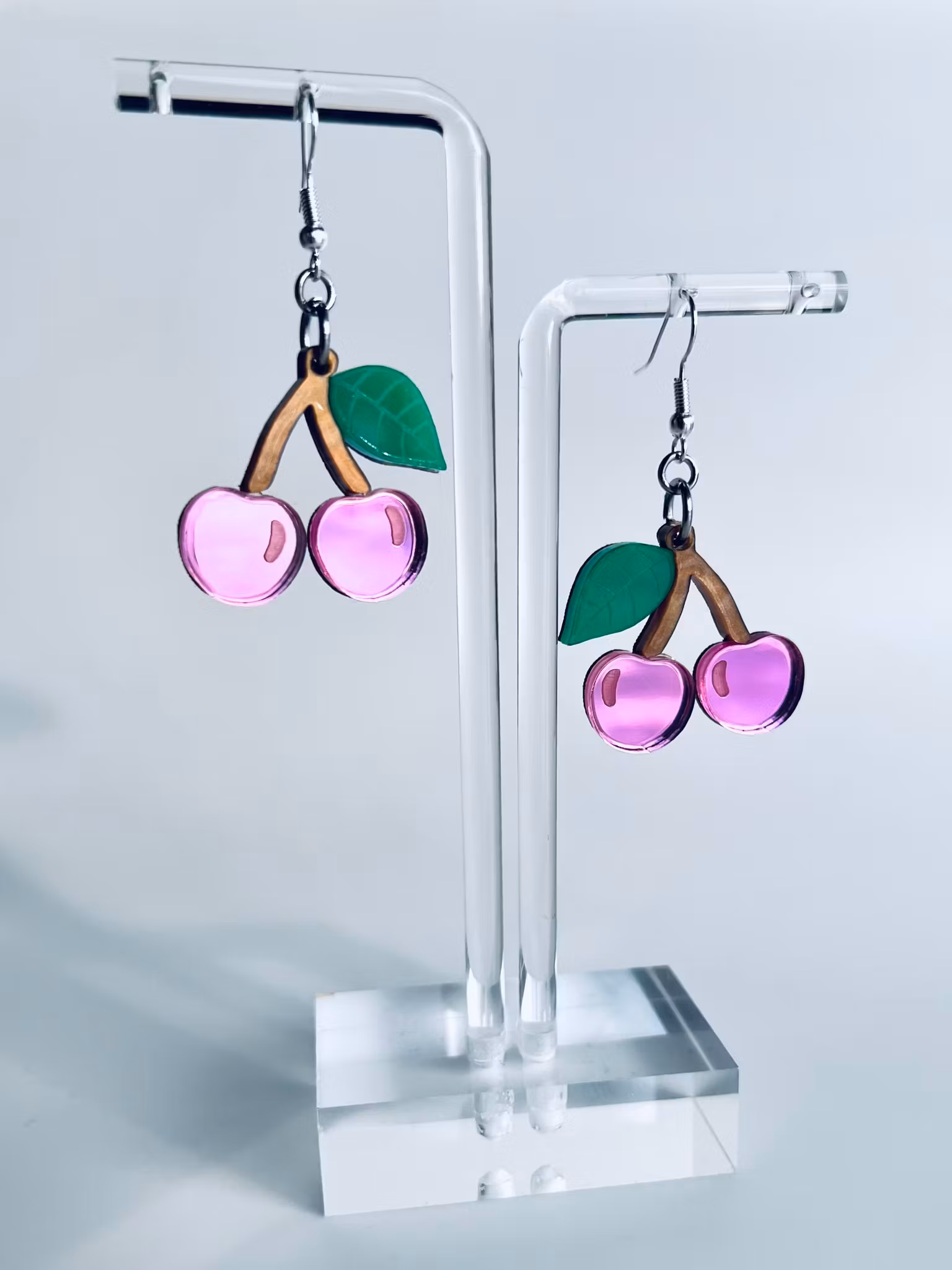 Unika och handgjorda örhängen i akryl med detaljer i spegelakryl, förstärkta på baksidan med vackert mörk trä. Dessa örhängen är lättviktiga och otroligt vackra men svårfotade då det är just spegelakryl - de är ännu vackrare i verkligheten! De monteras för hand av olika laserskurna delar för att bilda en helhet. Ett smycke för den som söker något speciellt och småskaligt! De mäter 3 cm och kommer på krokar, går att byta till clicker hoops via tillval.