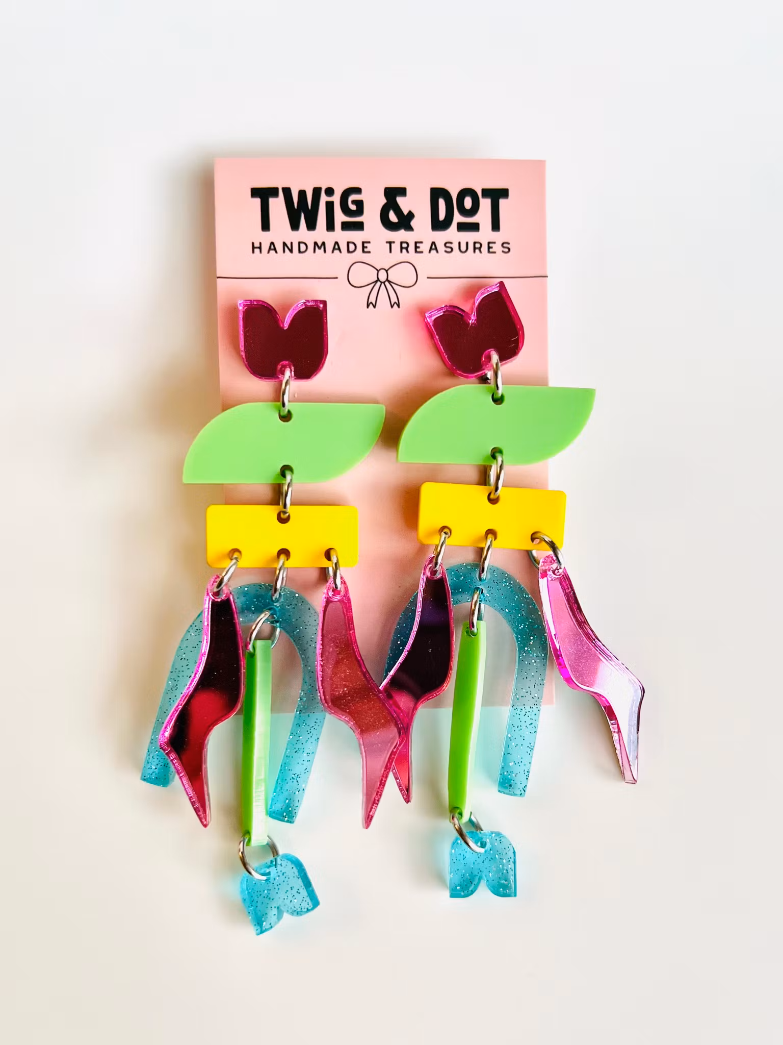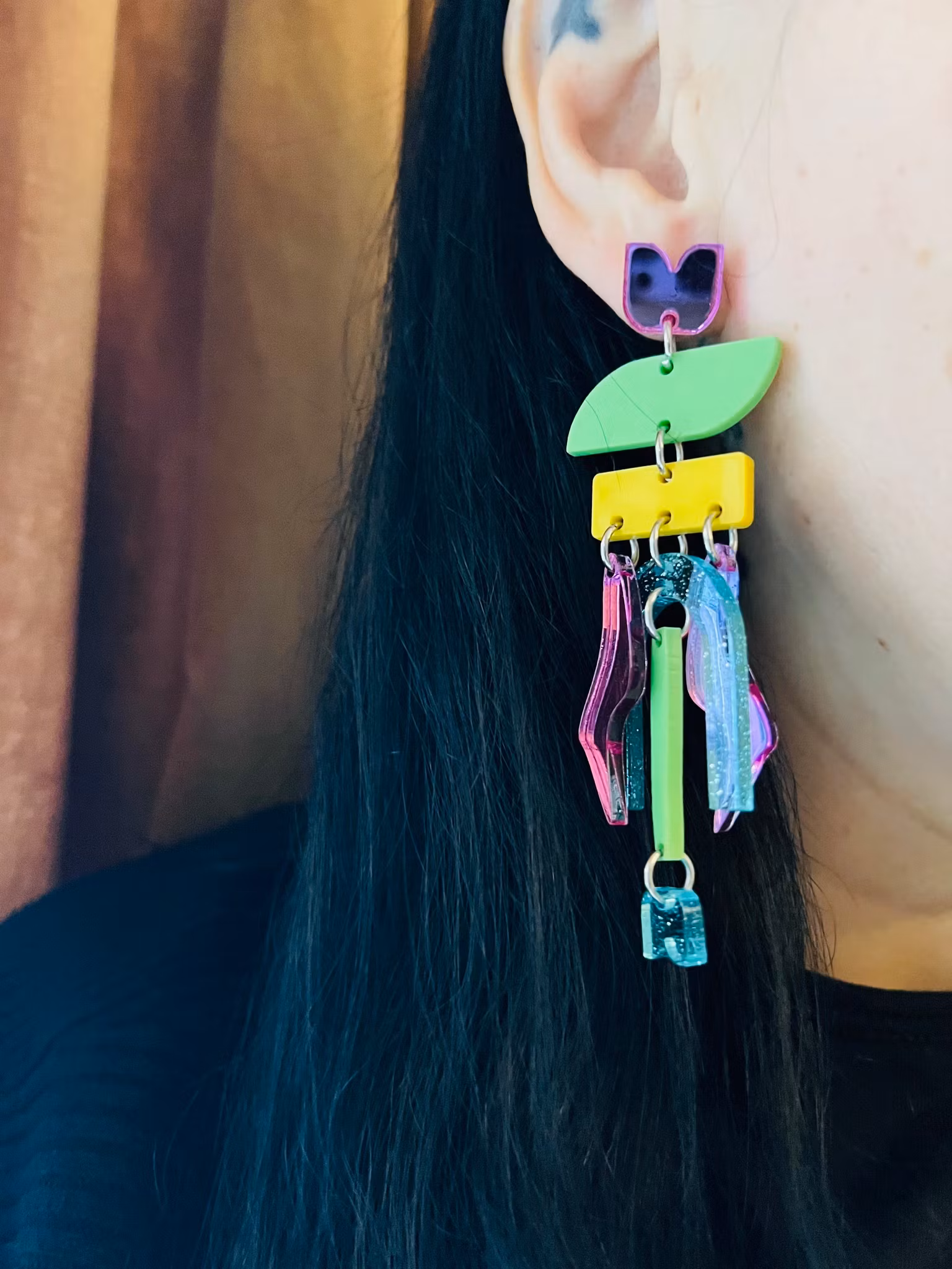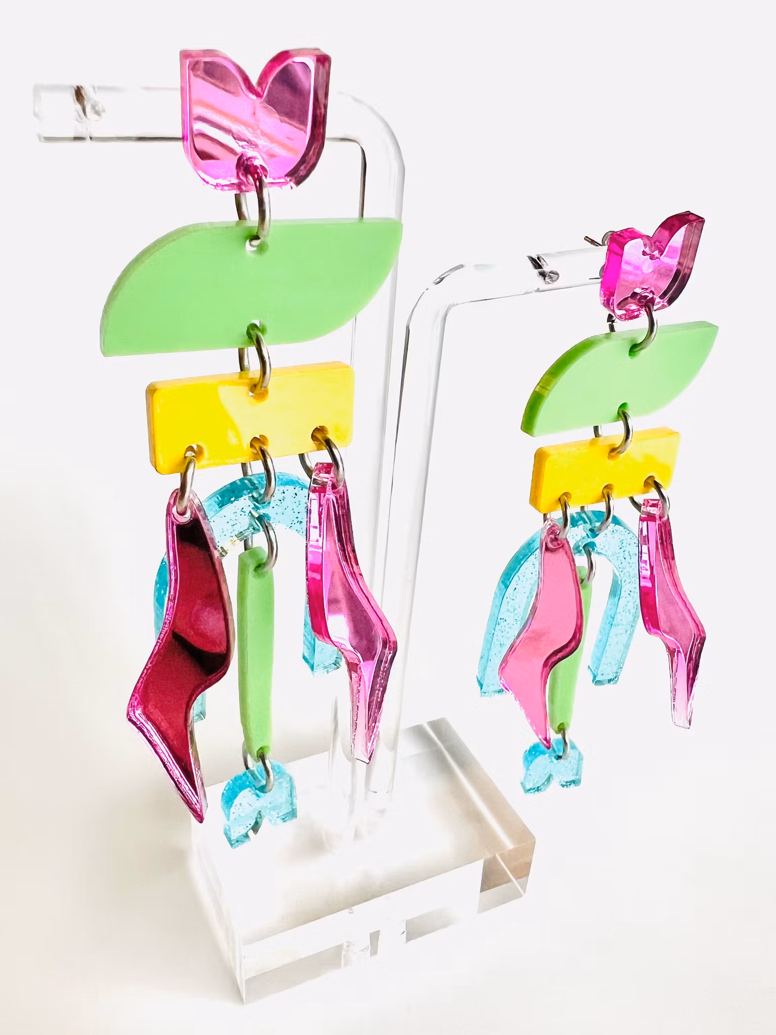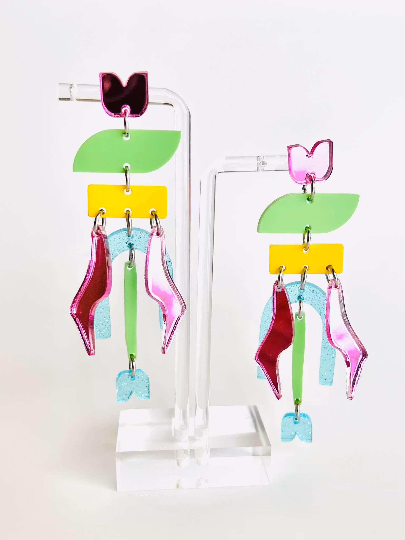 Unika och handgjorda örhängen i akryl. Dessa örhängen är lättviktiga och de monteras för hand av olika laserskurna delar för att bilda en helhet. Ett smycke för den som söker något speciellt och småskaligt! De mäter 8 cm.