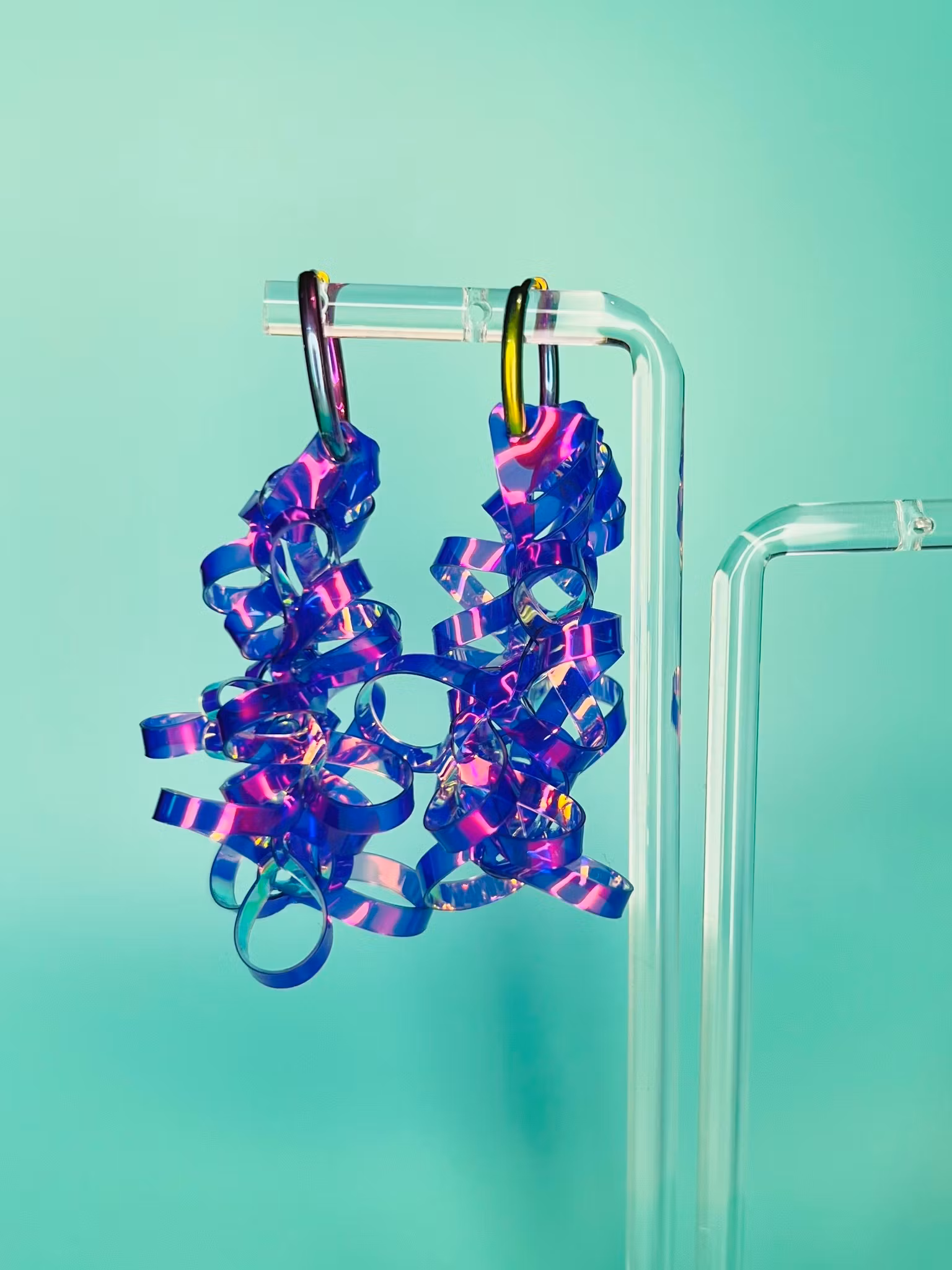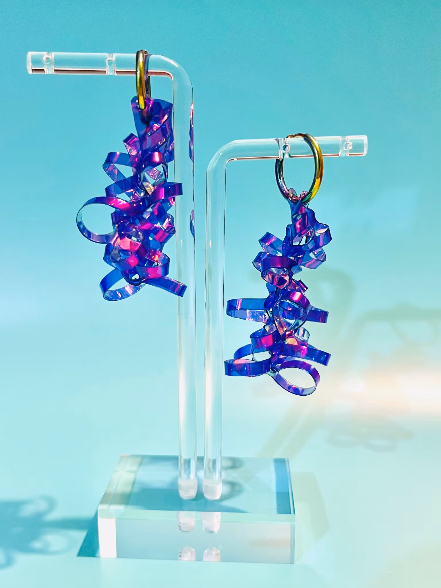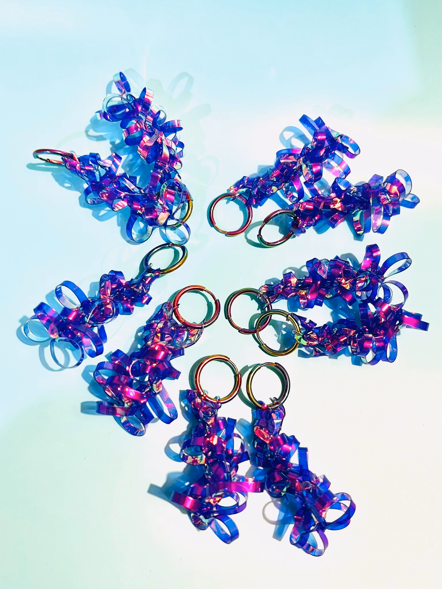 Lätta, magiskt vackra örhängen som skiftar i skimrande, iriserande färger som ändras i olika vinklar och mot olika bakgrundsfärger! Otroligt coola handgjorda örhängen! Som allt ”holo” är de svåra att fota för att ge en rättvis bild av färgspelet men bilderna ger en bra uppfattning om hur de ser ut i olika vinklar och med olika bakgrunder.