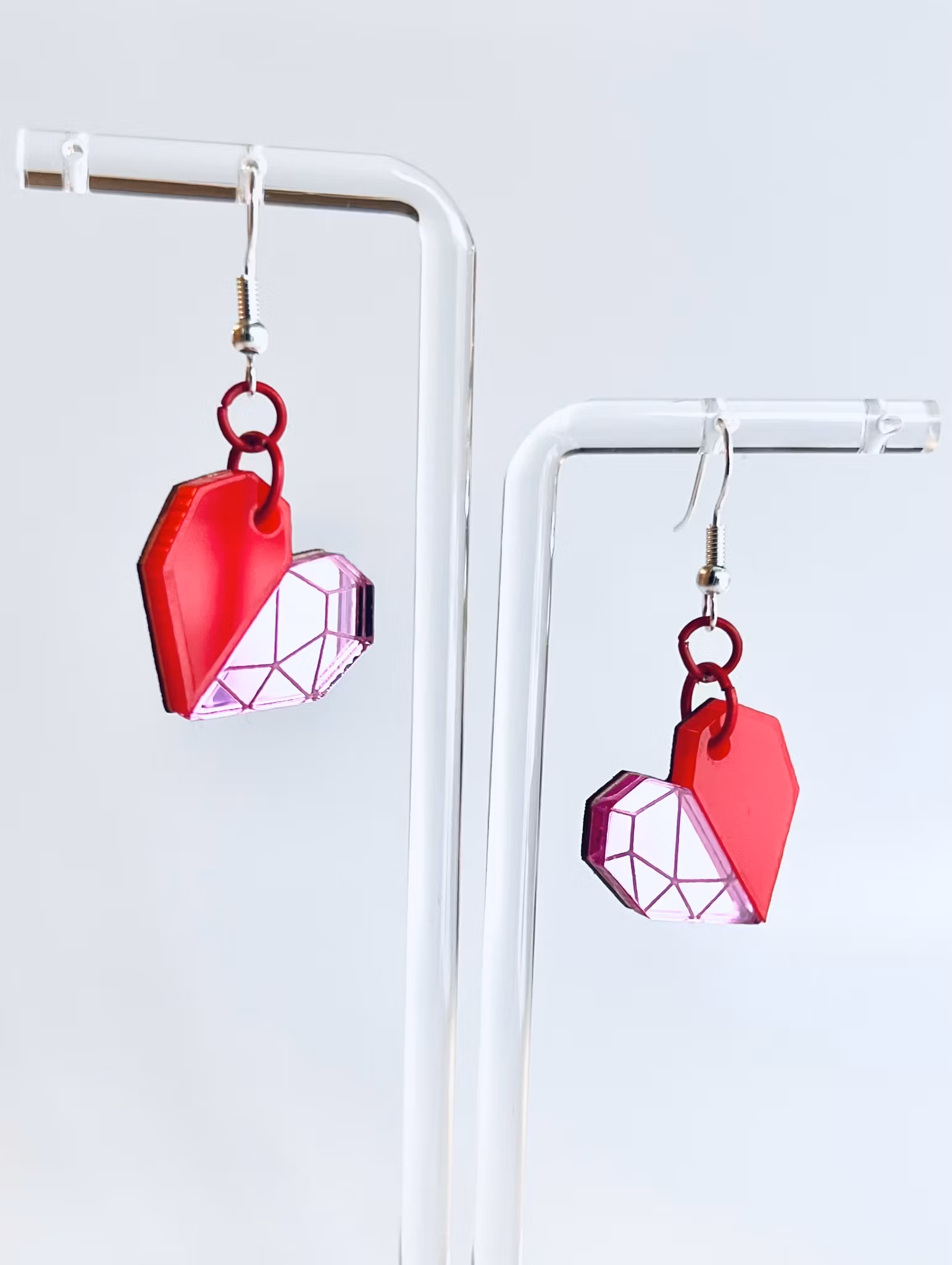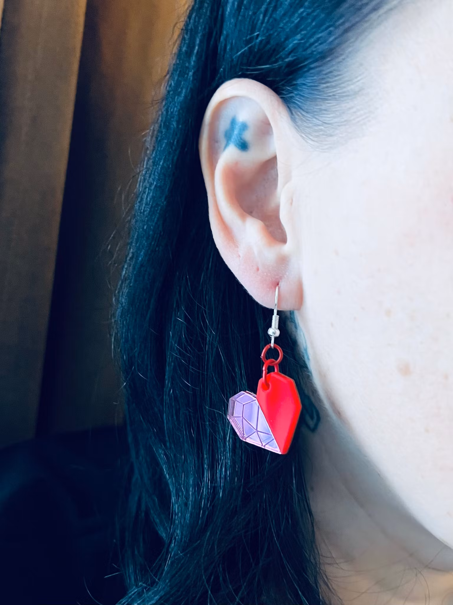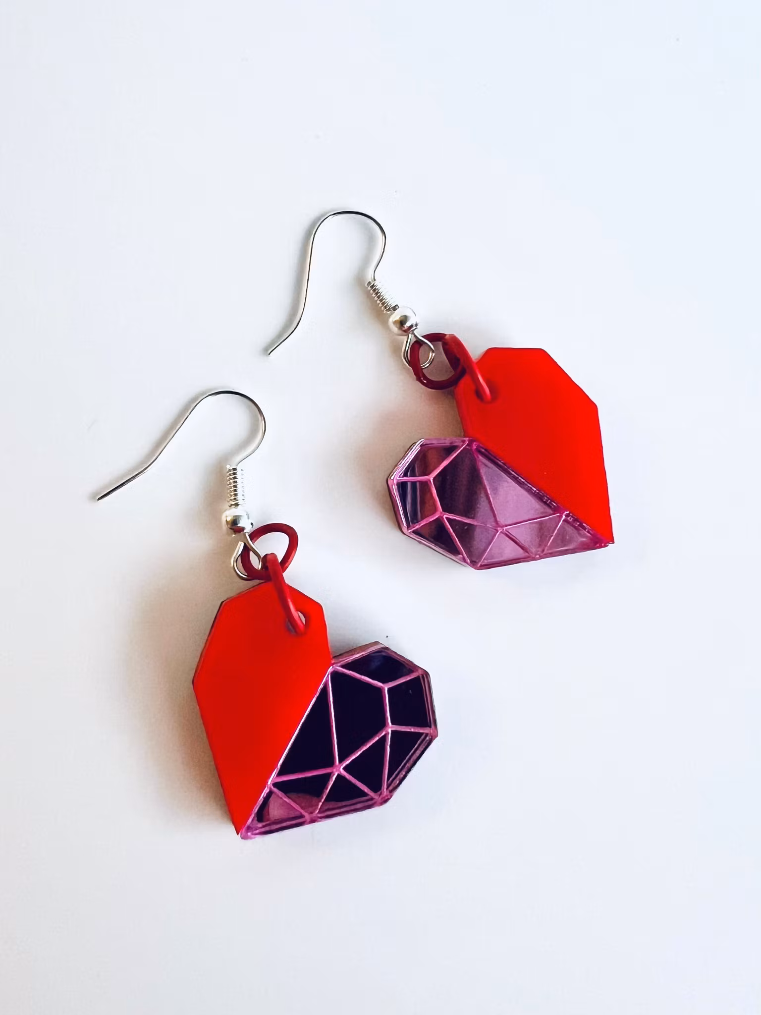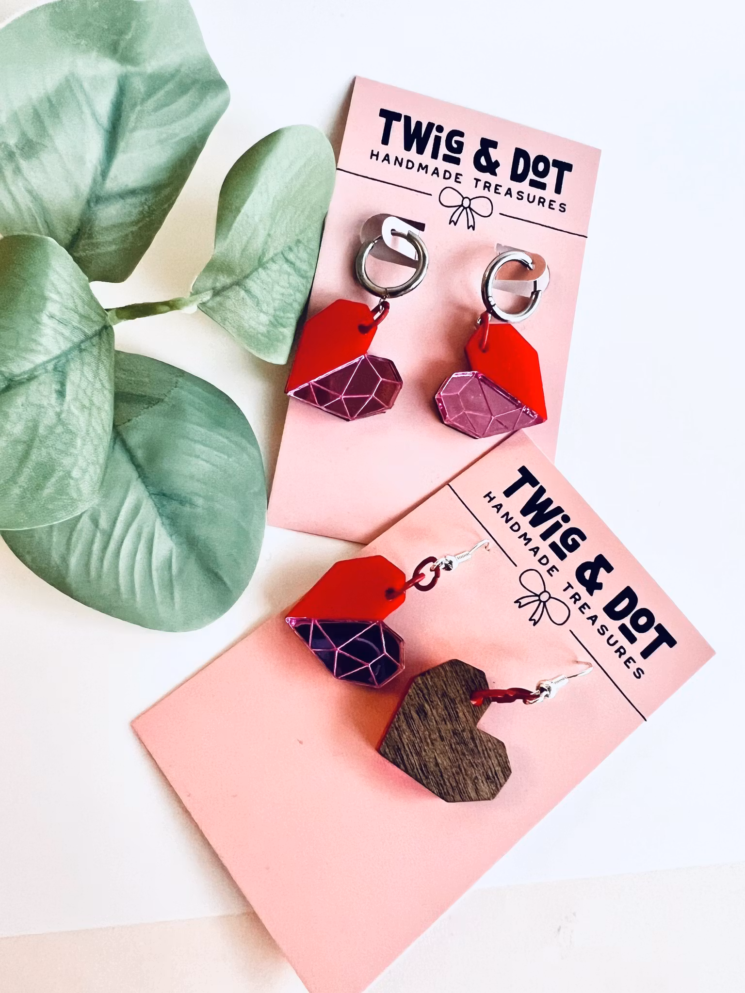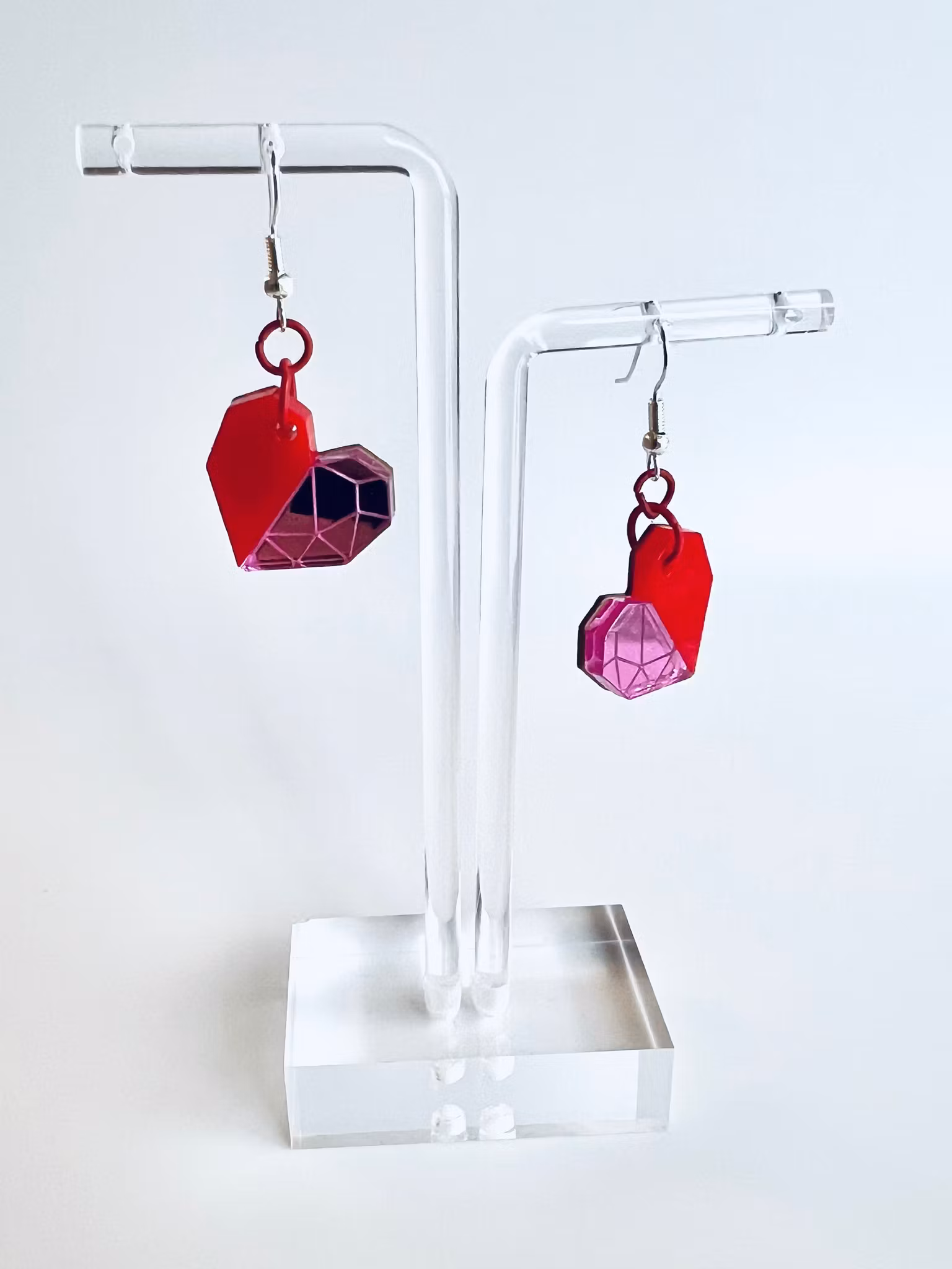 Unika och handgjorda örhängen i akryl med detaljer i spegelakryl, förstärkta på baksidan med vackert mörk trä. Dessa örhängen är lättviktiga och otroligt vackra men svårfotade då det är just spegelakryl - de är ännu vackrare i verkligheten! De monteras för hand av olika laserskurna delar för att bilda en helhet. Ett smycke för den som söker något speciellt och småskaligt! De mäter 2.3 cm och kommer på krokar, går att byta till clicker hoops via tillval.