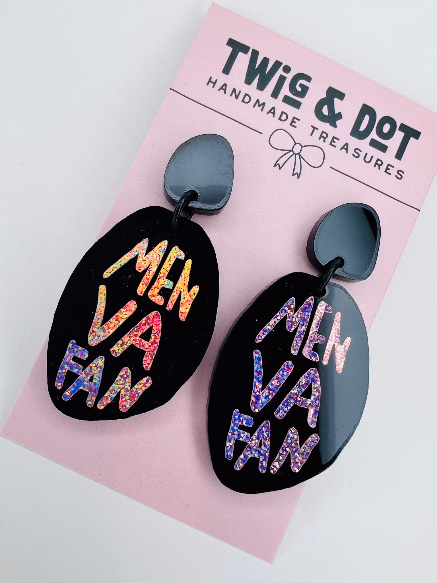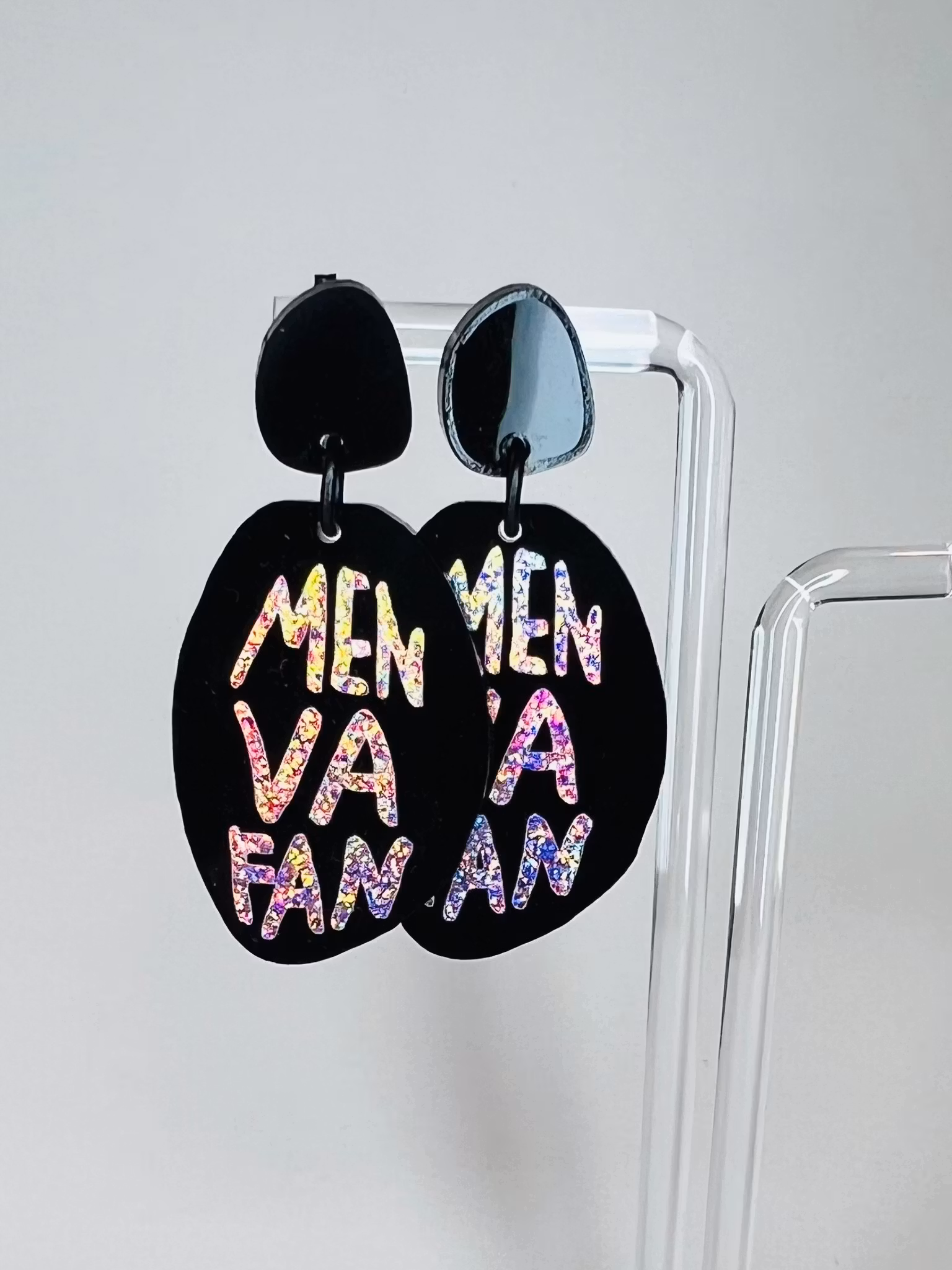 Unika och handgjorda örhängen i akryl med hologlittrande text. Kommer som stift men går att byta via tillval till clicker hoops. Limiterad upplaga. Dessa örhängen är lättviktiga och otroligt vackra men svårfotade då texten är glittrig - de är ännu vackrare i verkligheten! De monteras för hand av olika laserskurna delar för att bilda en helhet. Ett smycke för den som söker något speciellt och småskaligt! Brickan med text mäter 3 cm.