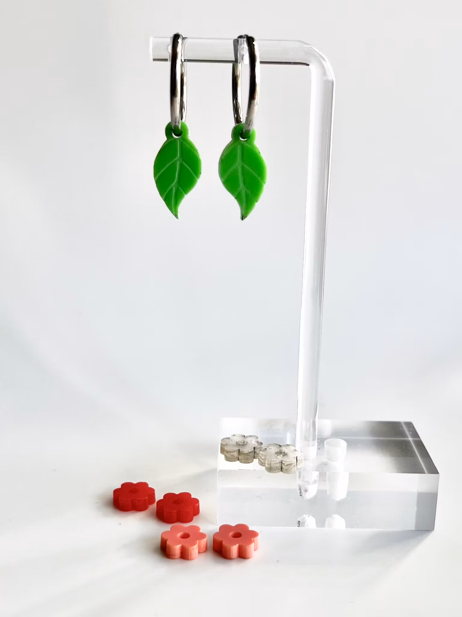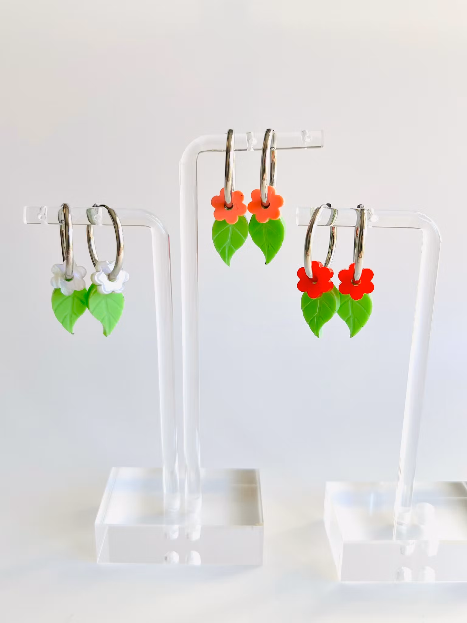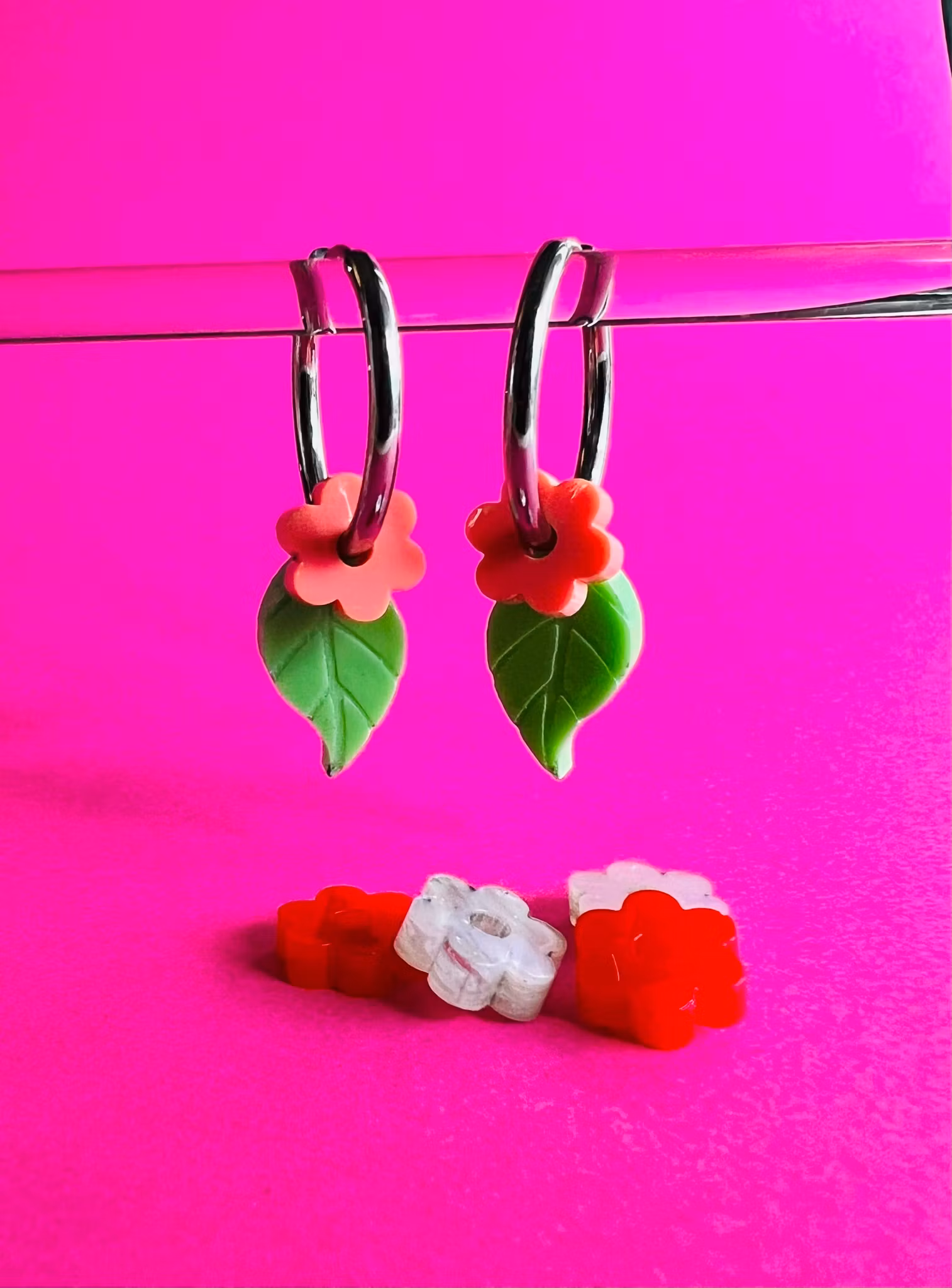 Unika och handgjorda örhängen högkvalitativ akryl. Du får ett par clicker hoops samt två stycken gröna blad och sex stycken små blommor i tre olika färger. Växla mellan färgerna på blommorna ihop med bladet, när endast bladet eller endast blommorna! Flera örhängen i ett!