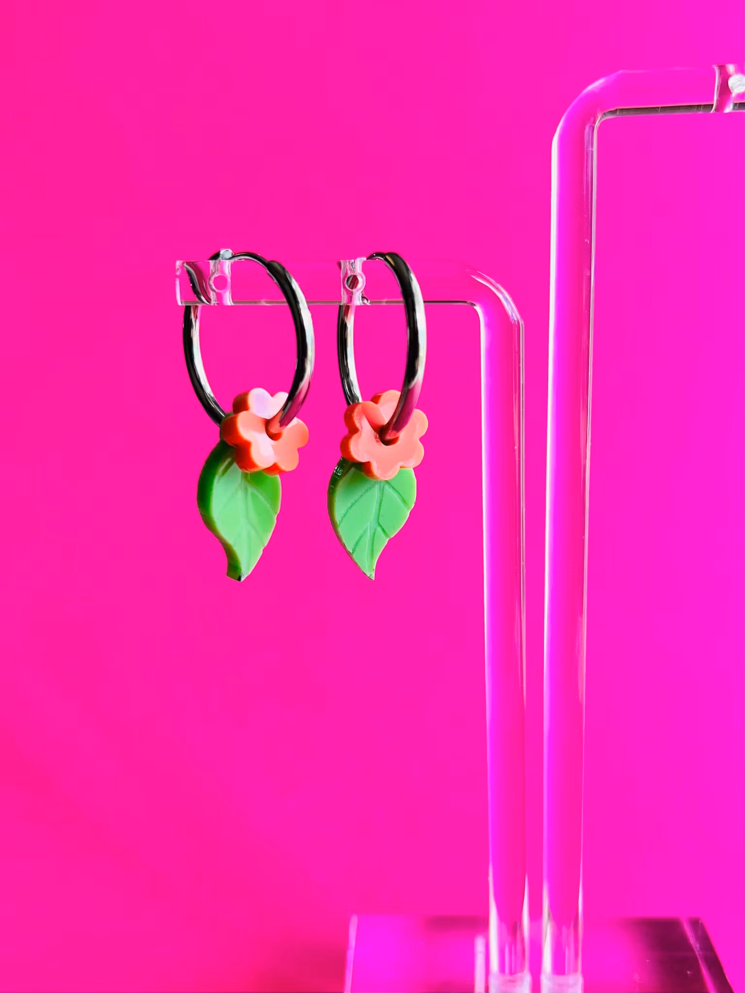 Dessa örhängen är lättviktiga och monteras för hand av laserskurna delar. Ett smycke för den som söker något speciellt och småskaligt! Bladet mäter 2,2 cm, blommorna 1 cm och hoopsen 2,2 cm stora.