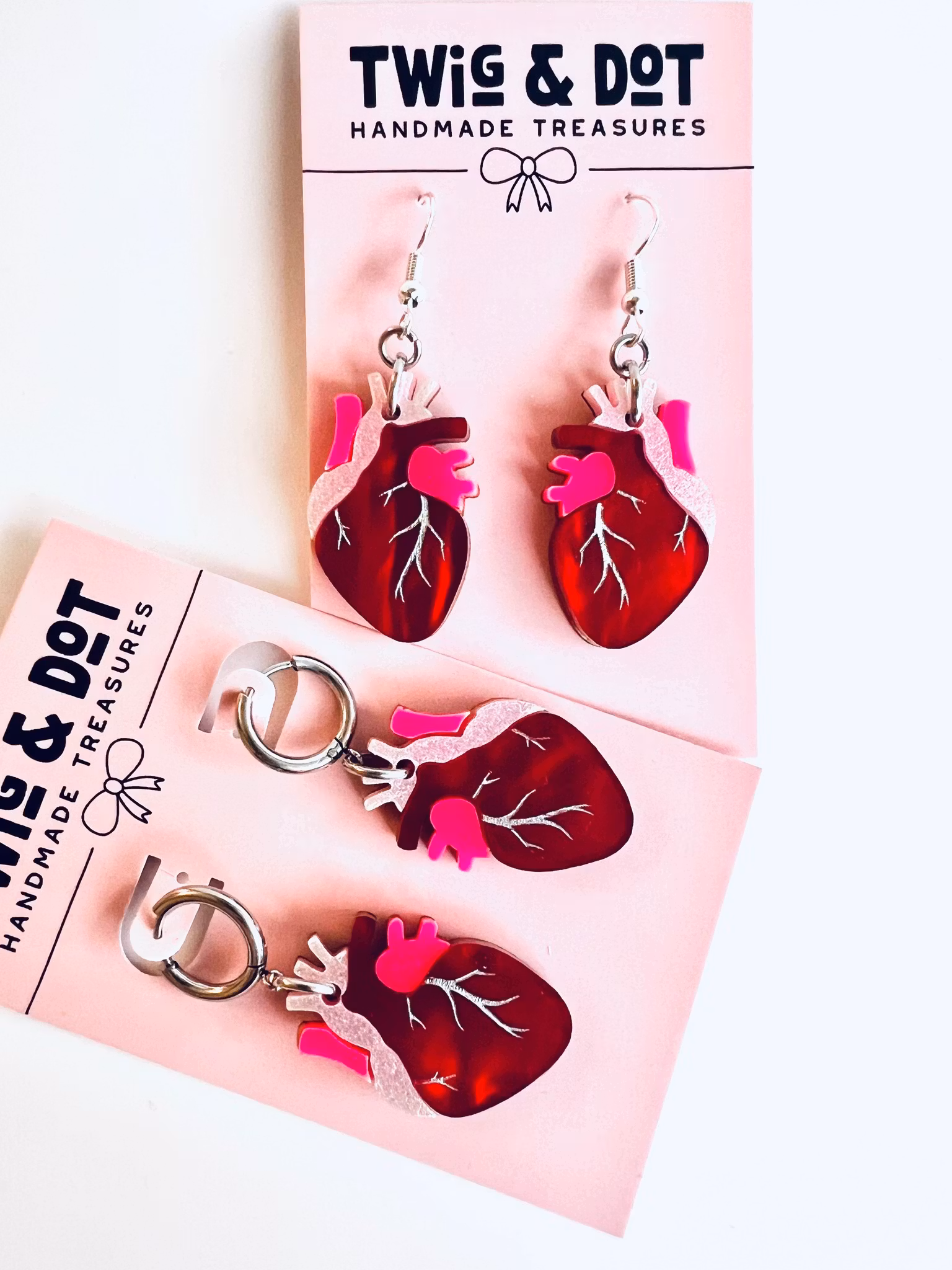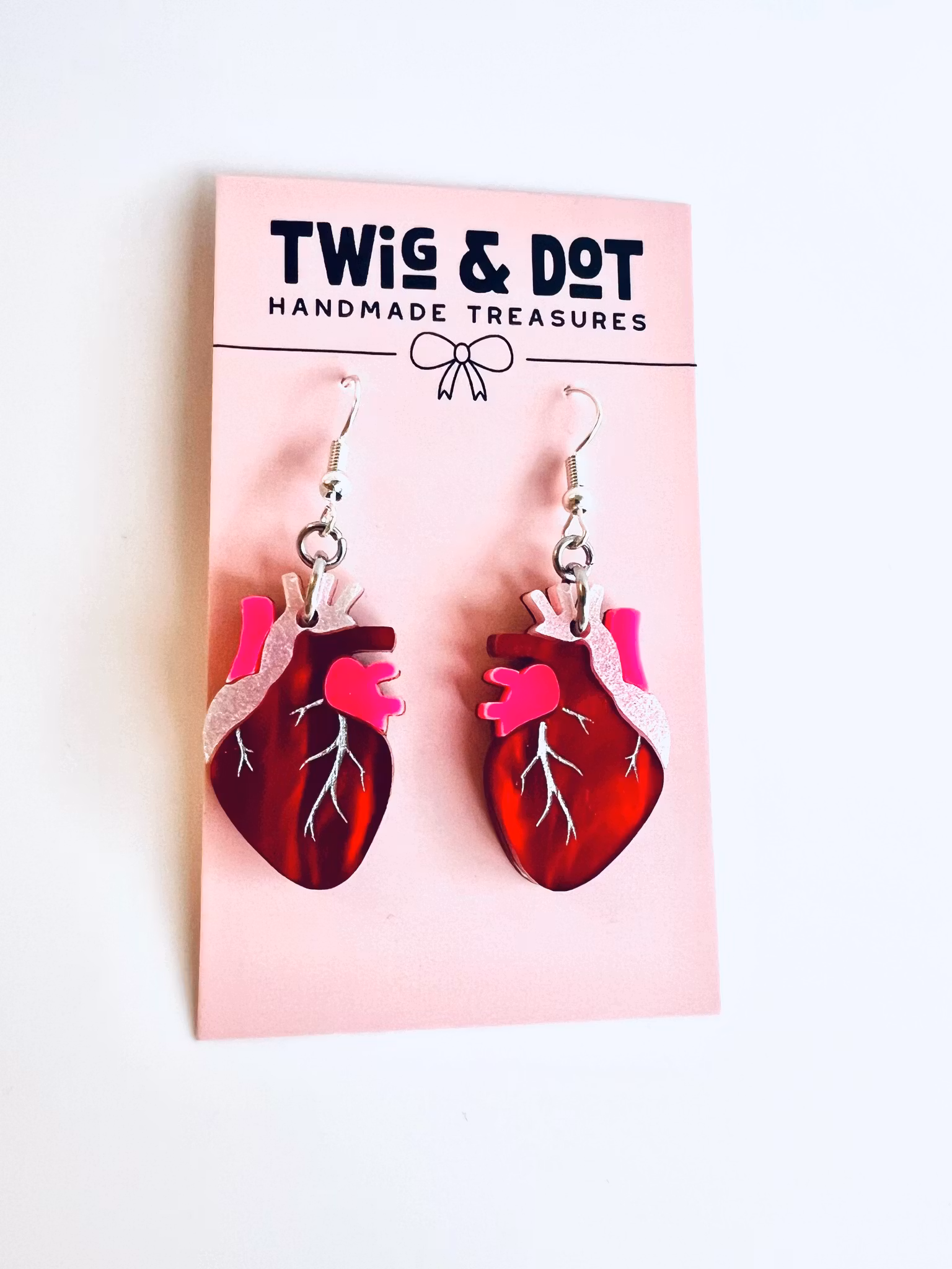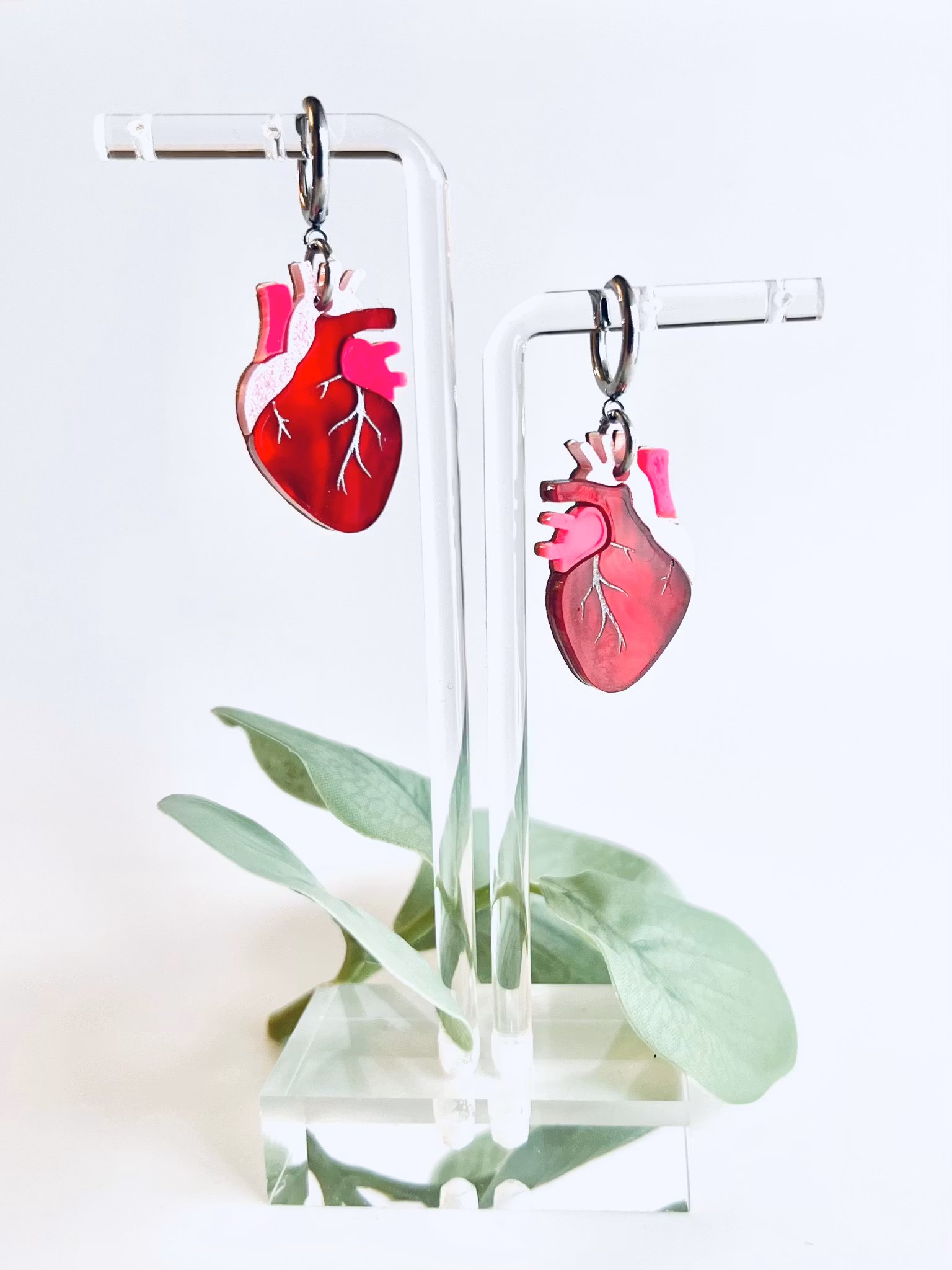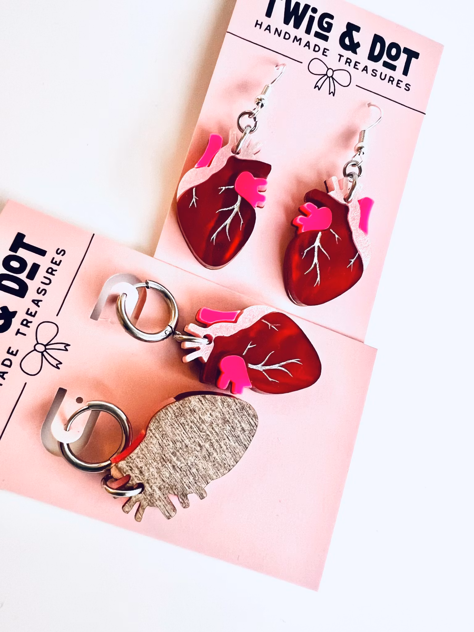 Unika och handgjorda örhängen i akryl med handmålade detaljer, förstärkta på baksidan med vackert mörk trä. Dessa örhängen är lättviktiga och otroligt vackra men svårfotade - de är ännu vackrare i verkligheten! De monteras för hand av olika laserskurna delar för att bilda en helhet. Ett smycke för den som söker något speciellt och småskaligt! De mäter 3,5 cm och kommer på krokar, går att byta till clicker hoops via tillval.