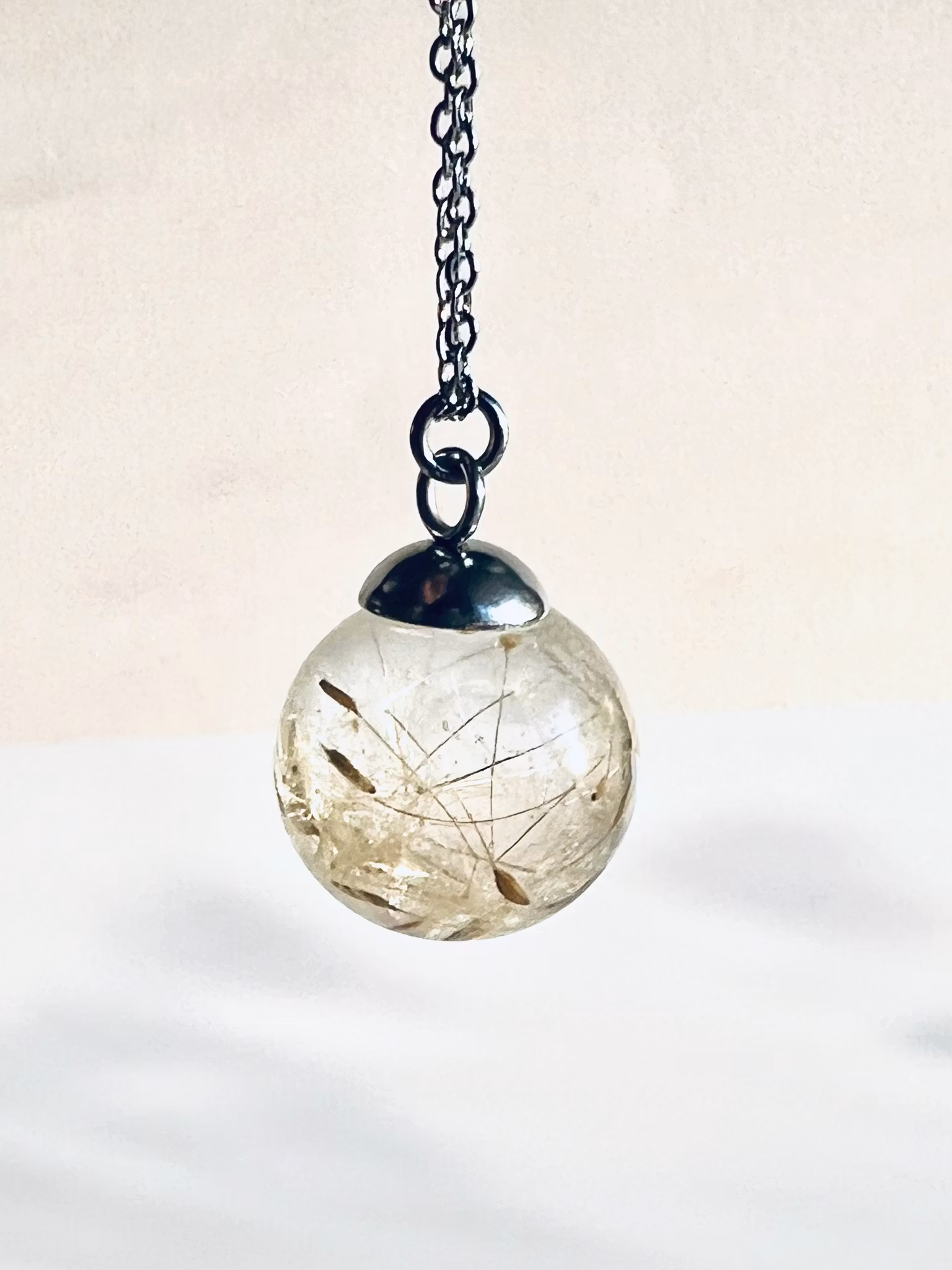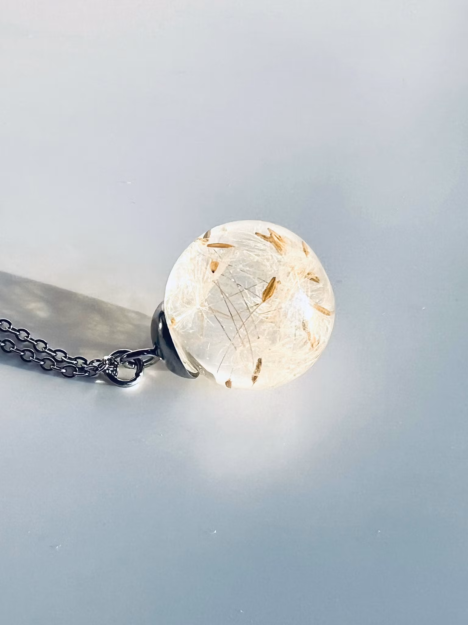 En liten bit av den unika naturen i form av ett halsband att bära med sig. Ett trolskt och flyktigt ögonblick för alltid låst i tiden, ett halsband du blir helt ensam om eftersom allt från naturen är unikt och eget - precis som du. Maskrosfrön ingjutet i hårt resin som påminner om glas, hänger på en kedja i rostfritt stål. Kulan mäter ca 2,5 cm i diameter.