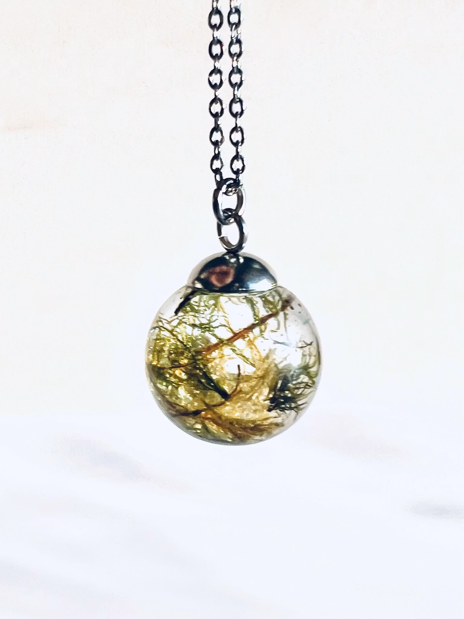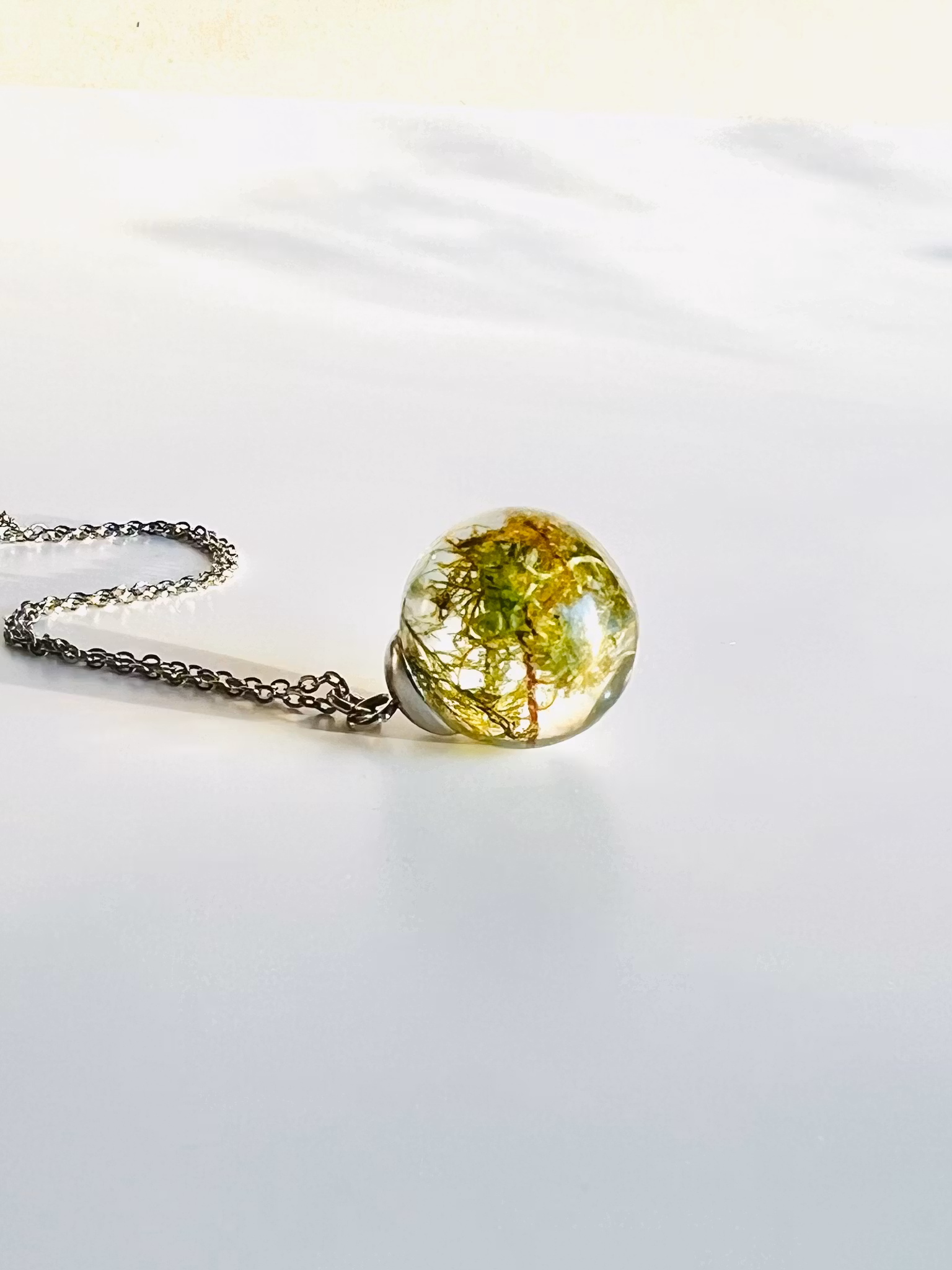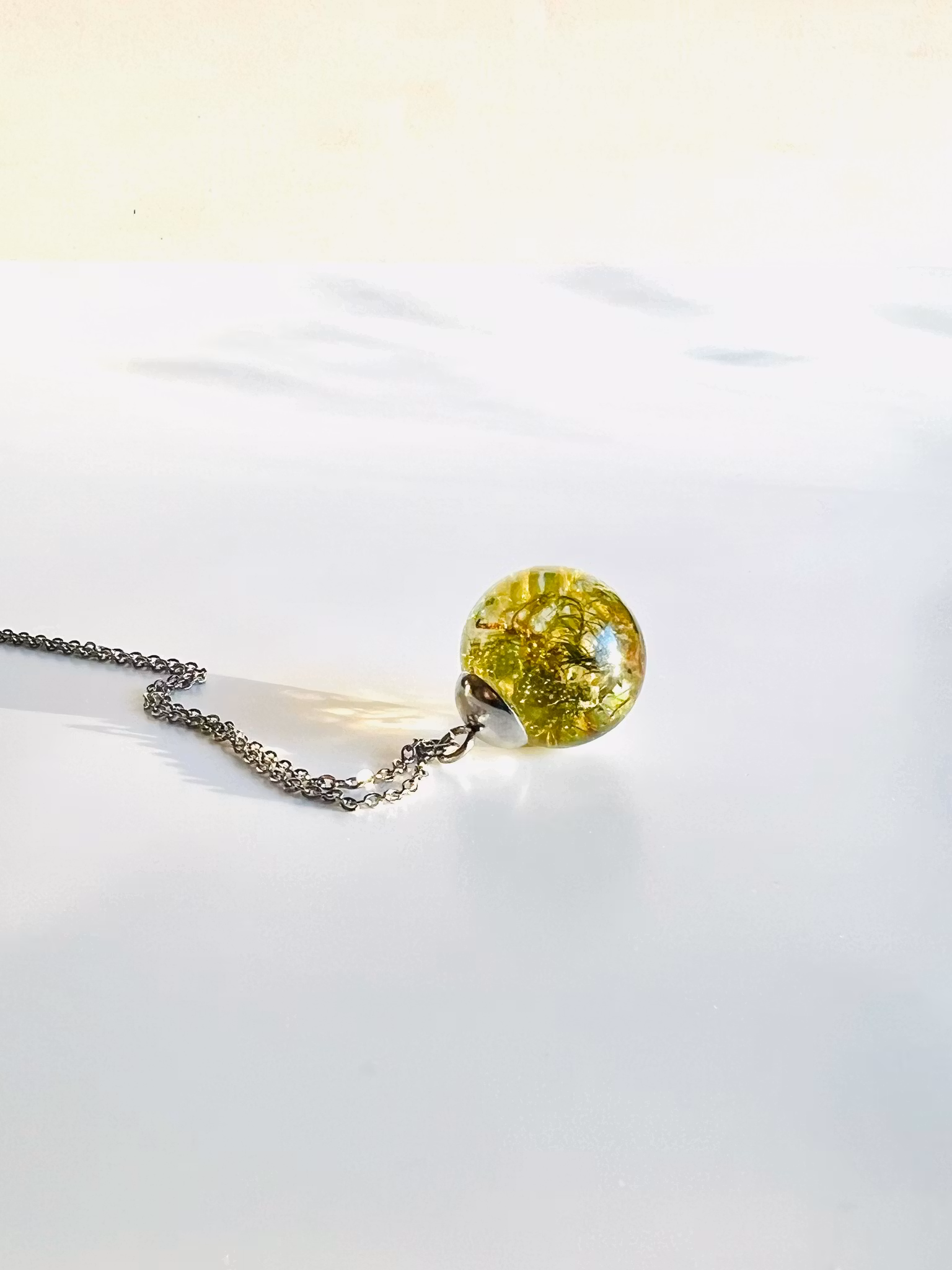 En liten bit av den unika naturen i form av ett halsband att bära med sig. Ett trolskt och flyktigt ögonblick för alltid låst i tiden, ett halsband du blir helt ensam om eftersom allt från naturen är unikt och eget - precis som du. Missa ingjutet i hårt resin som påminner om glas, hänger på en kedja i rostfritt stål. Kulan mäter ca 2,5 cm i diameter.