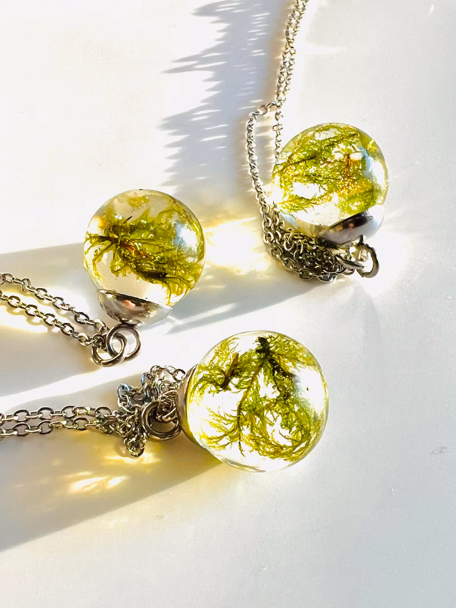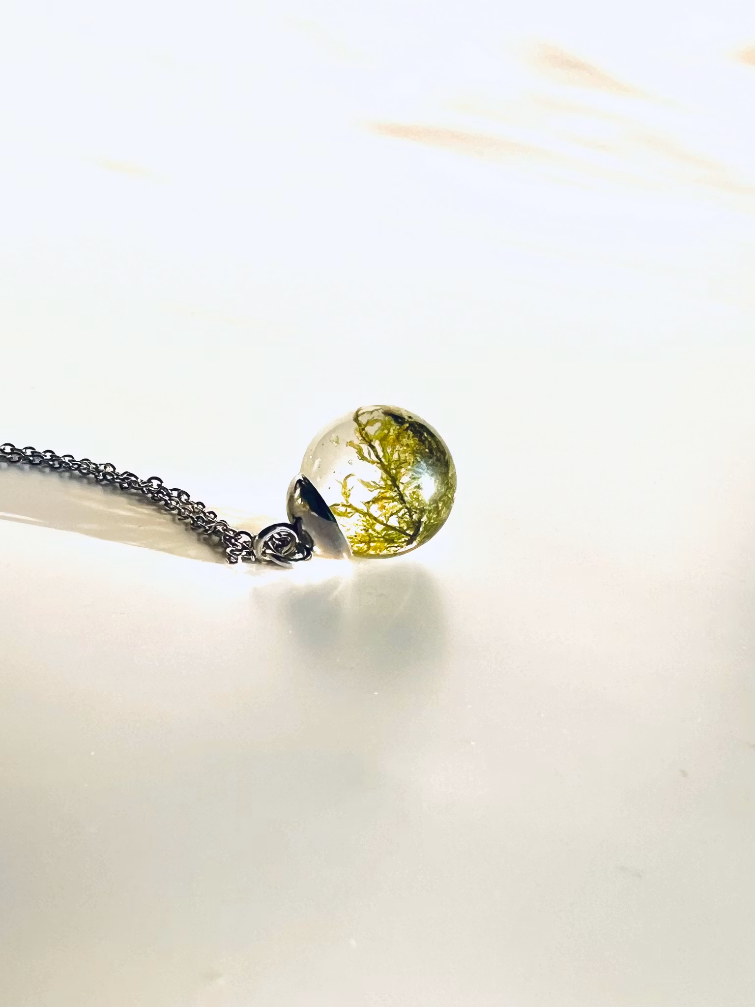 En liten bit av den unika naturen i form av ett halsband att bära med sig. Ett trolskt och flyktigt ögonblick för alltid låst i tiden, ett halsband du blir helt ensam om eftersom allt från naturen är unikt och eget - precis som du. Missa ingjutet i hårt resin som påminner om glas, hänger på en kedja i rostfritt stål. Kulan mäter ca 1,5 cm i diameter.