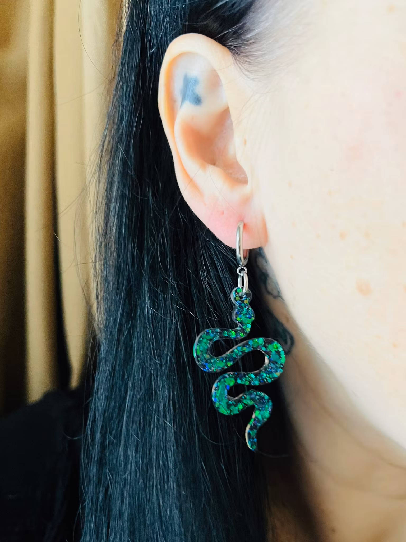 Vackra örhängen gjutet i hårt resin med glitter! Allt är handgjort och unikt, smycket är gjutet för hand. Mäter 5 cm stora. Kommer på silverkrokar, går även byta till clicker hoops i silver.