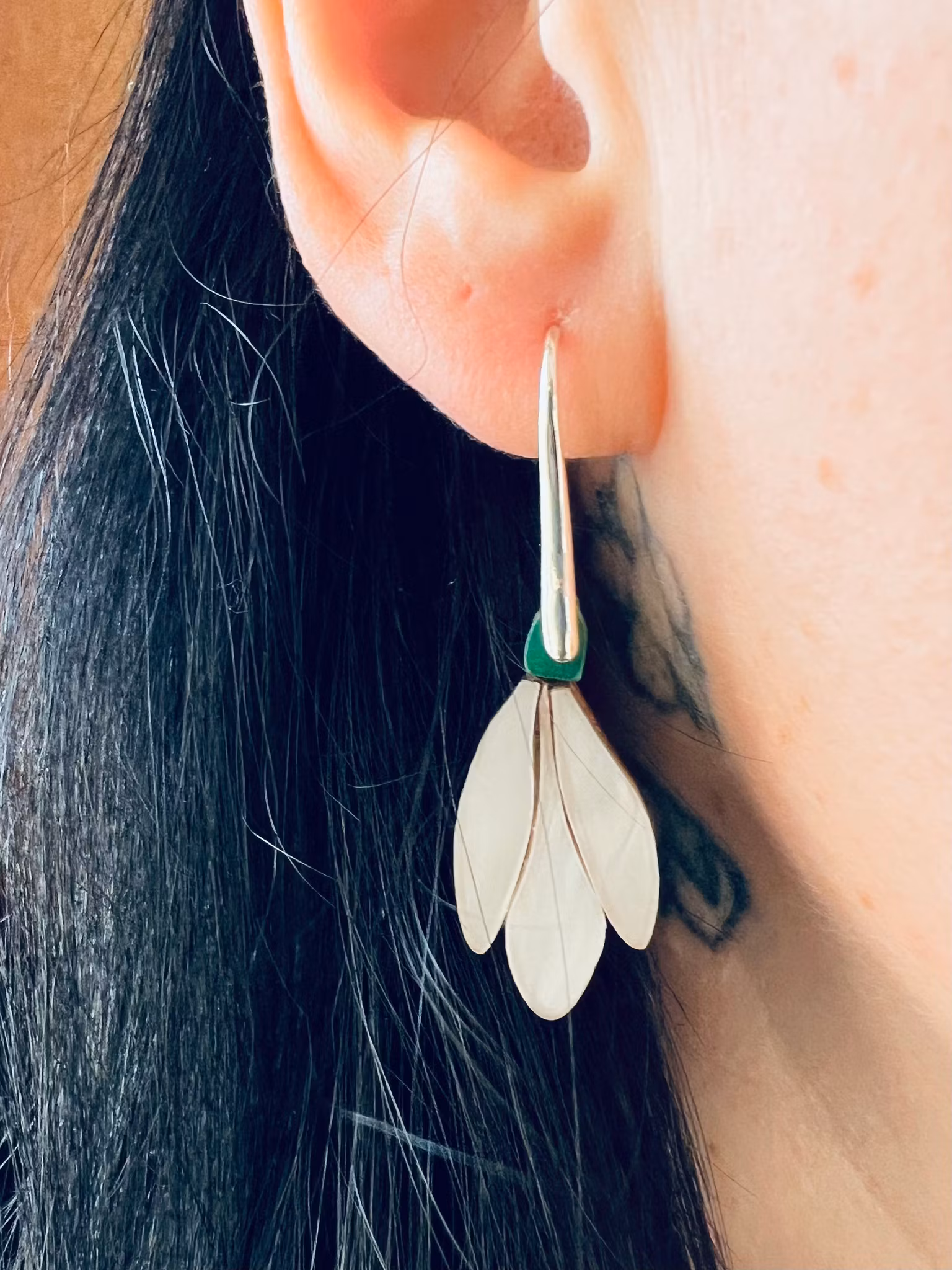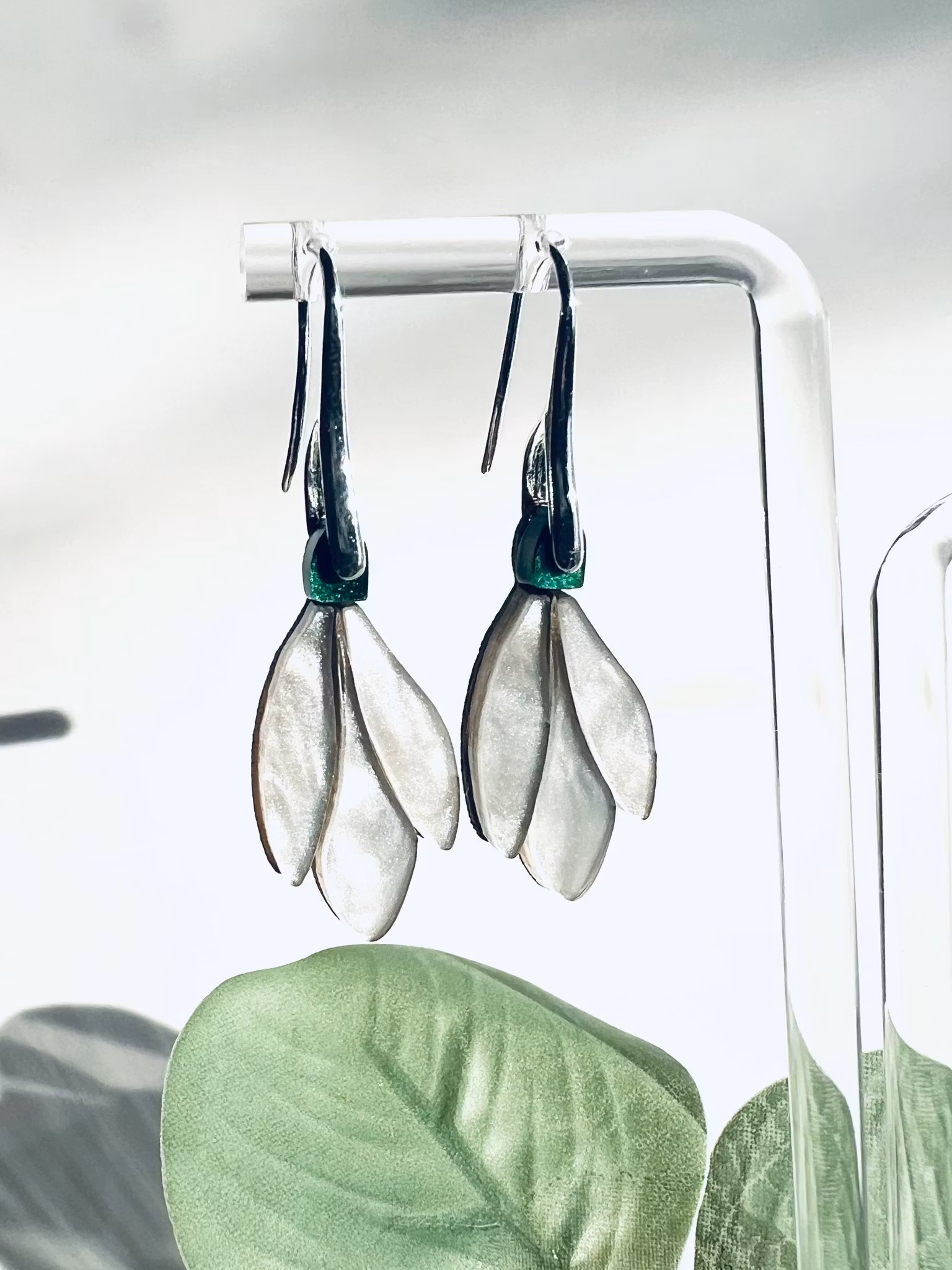Unika och handgjorda örhängen i akryl, förstärkta på baksidan med vackert mörk trä. Dessa örhängen är lättviktiga och de monteras för hand av olika laserskurna delar för att bilda en helhet. Ett smycke för den som söker något speciellt och småskaligt! De mäter 3 cm och kommer på krokar i sterlingsilver.