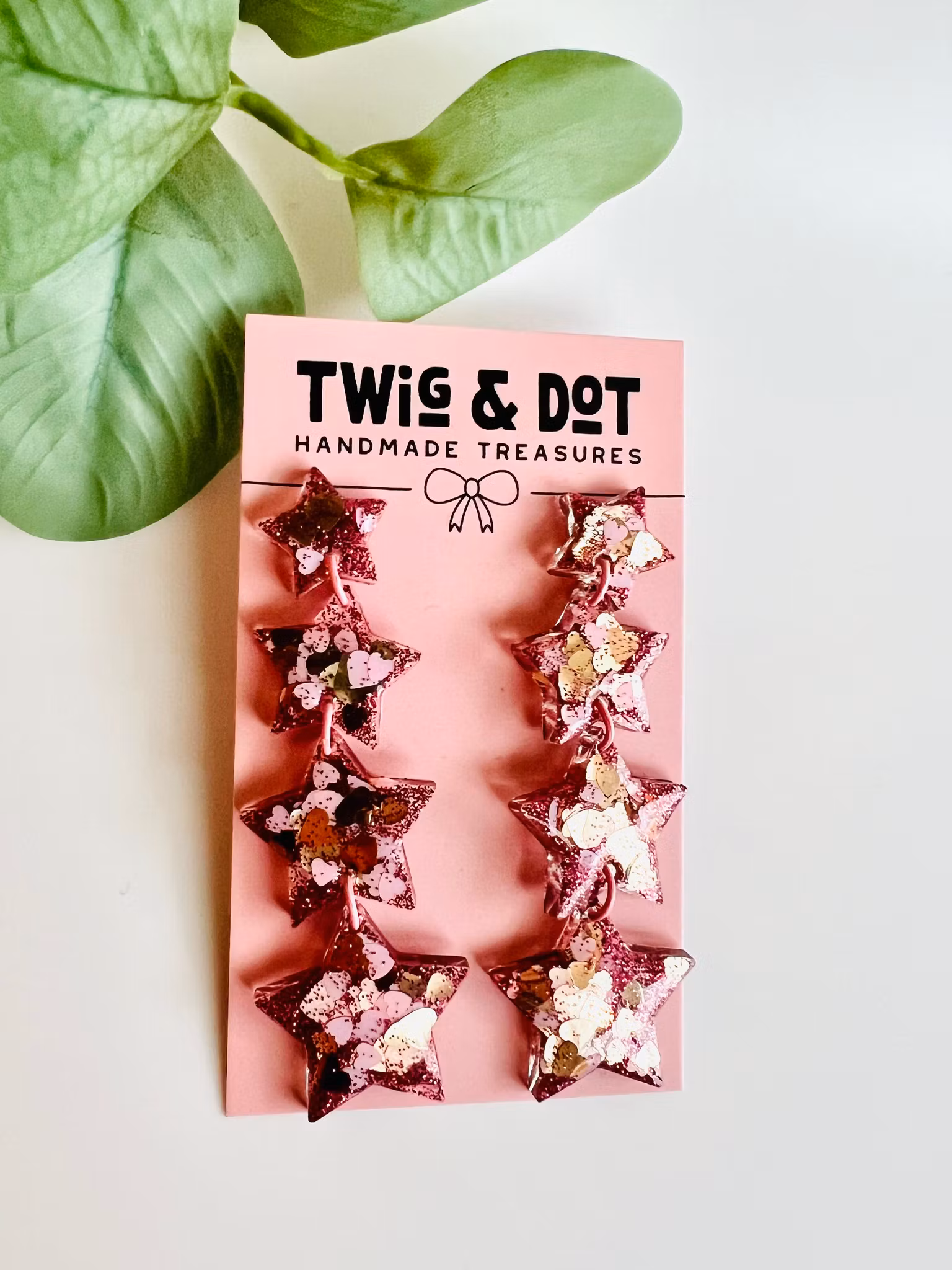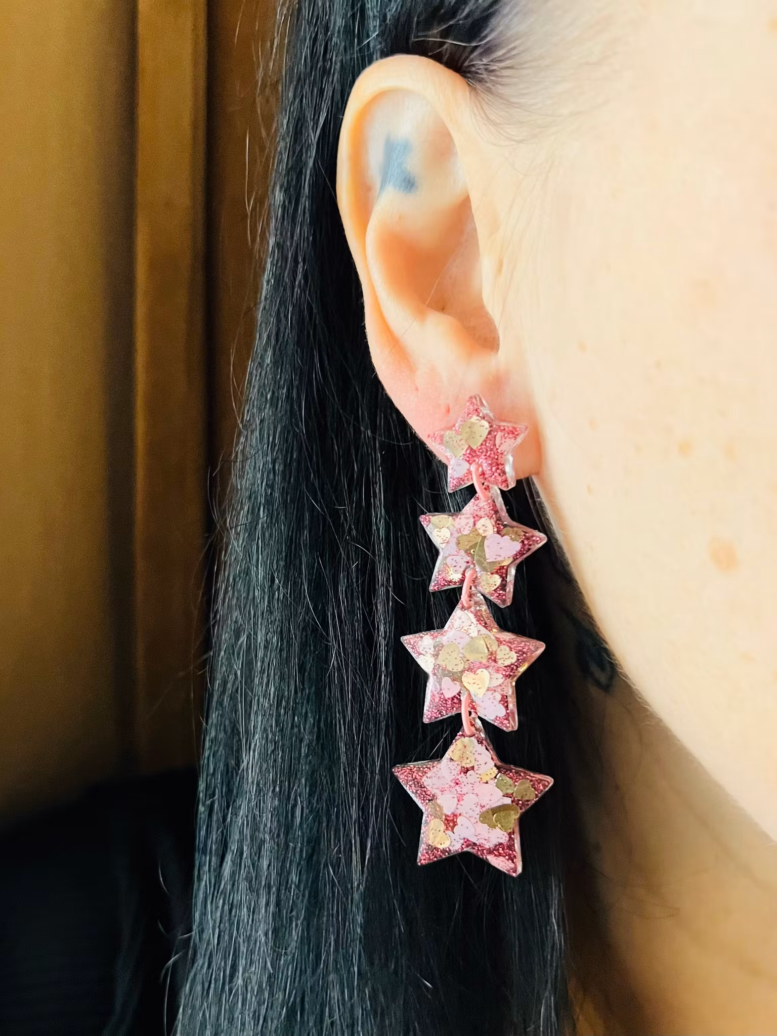 Vackra stjärnor gjutet i hårt resin med glitter! Allt är handgjort och unikt, smycket är gjutet för hand. Mäter 7,5 cm stora.