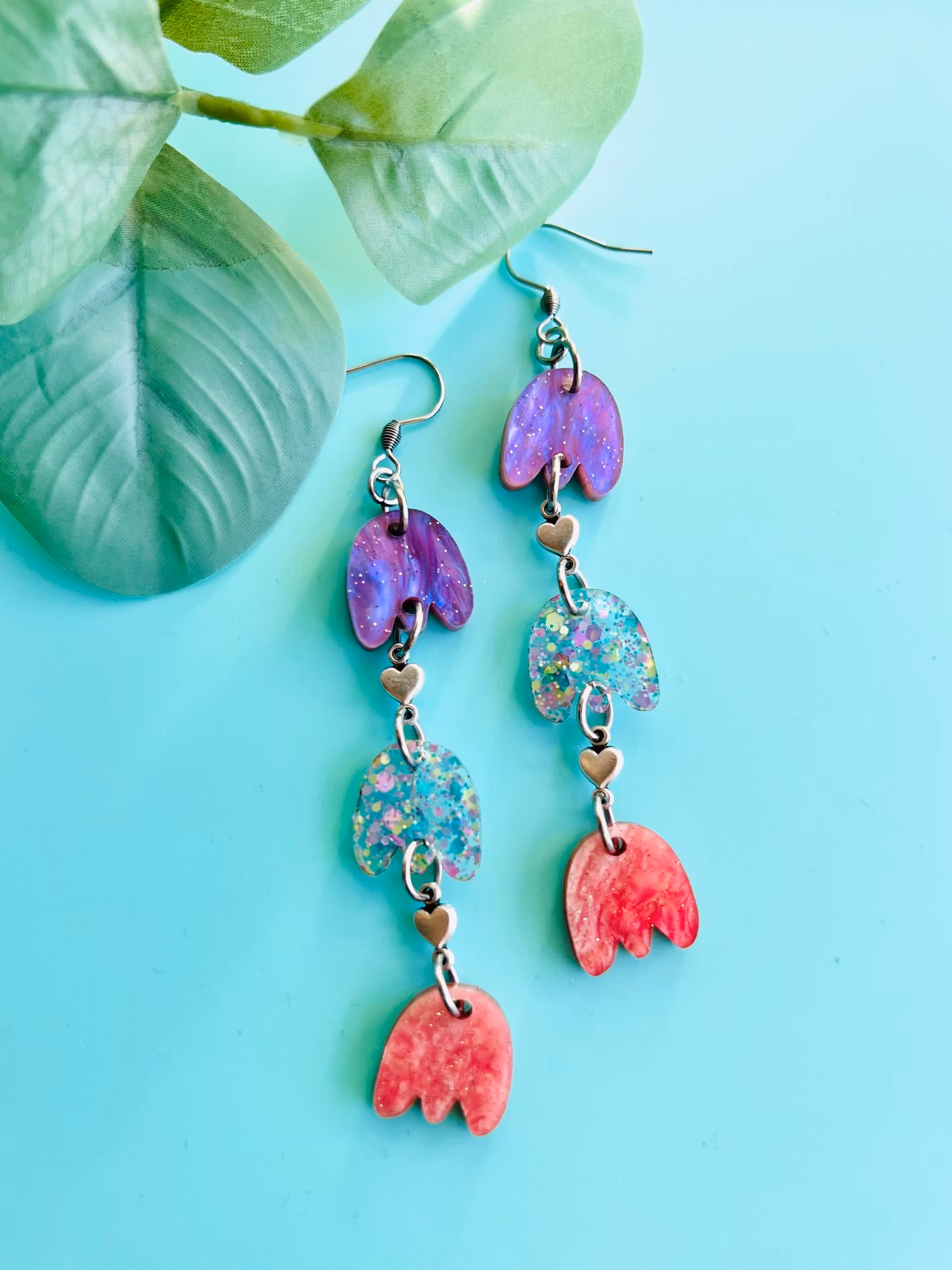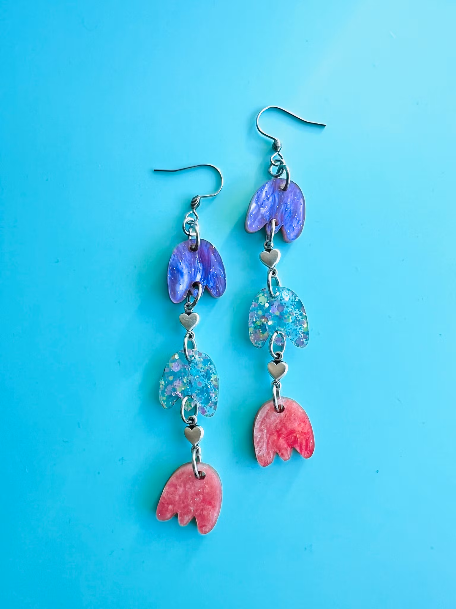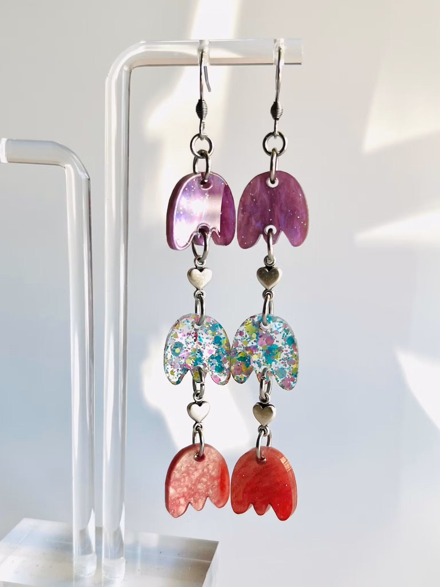 Unika och handgjorda örhängen i akryl. Dessa örhängen är lättviktiga och de monteras för hand av olika laserskurna delar för att bilda en helhet. Ett smycke för den som söker något speciellt och småskaligt! De mäter 8,5 cm.